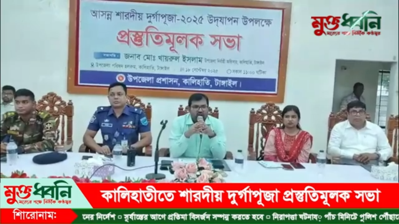 আসন্ন শারদীয় দুর্গাপূজা-২০২৫ সুষ্ঠু ও শান্তিপূর্ণভাবে উদযাপনের লক্ষ্যে টাঙ্গাইলের কালিহাতীতে আইন-শৃঙ্খলা বাহিনীর মতবিনিময় সভা অনুষ্ঠিত হয়েছে। শনিবার (২০ সেপ্টেম্বর) সকাল ১১টায় কালিহাতী থানা প্রাঙ্গণে এ মতবিনিময়ের আয়োজন করা হয়। অনুষ্ঠানে প্রধান অতিথি ছিলেন টাঙ্গাইলের অতিরিক্ত পুলিশ সুপার (প্রশাসন ও অর্থ) রবিউল ইসলাম, বিশেষ অতিথি ছিলেন অতিরিক্ত পুলিশ সুপার (কালিহাতী সার্কেল) আব্দুল্লাহ আল ইমরান, কালিহাতী থানার অফিসার ইনচার্জ মাহবুবুর রহমান, থানার ওসি (তদন্ত) শরিফুল ইসলাম, কালিহাতী আর্মি ক্যাম্পের কমান্ডার লেফটেন্যান্ট ইশতিয়াক হোসেন নাসিফ। এছাড়াও উপস্থিত ছিলেন, উপজেলা পূজা উদযাপন ফ্রন্টের আহ্বায়ক প্রদীপ ব্যানার্জী নীরু, সদস্য সচিব প্রবাল ভট্টাচার্য মানিক, বিভিন্ন রাজনৈতিক দলের নেতা, শিক্ষক, সরকারি কর্মকর্তা এবং হিন্দু সম্প্রদায়ের নেতৃবৃন্দ। জানা গেছে, এবার উপজেলায় ১৬৮টি পূজামণ্ডপে পূজা উদযাপিত হবে। অতিরিক্ত পুলিশ সুপার (প্রশাসন ও অর্থ) রবিউল ইসলাম বলেন, ধর্ম যার যার, উৎসব সবার। আমরা চাই সবাই মিলে আনন্দমুখর পরিবেশে দুর্গাপূজা উদযাপিত হোক। পূজা উপলক্ষে কেউ বাড়িঘর খালি রাখবেন না, কারণ অপরাধীরা সুযোগ নিতে পারে। কোনো সমস্যায় পড়লে সঙ্গে সঙ্গে প্রশাসনকে জানান। প্রতিটি পূজামণ্ডপ সিসি ক্যামেরার আওতায় আনতে হবে। অতিরিক্ত পুলিশ সুপার (কালিহাতী সার্কেল) আব্দুল্লাহ আল ইমরান বলেন, “কালিহাতীতে সবসময়ই সাম্প্রদায়িক সম্প্রীতির বন্ধন অটুট ছিল। আমরা চাই এ সম্প্রীতি আরও দৃঢ় হোক। আইন-শৃঙ্খলা বাহিনী সর্বদা সতর্ক অবস্থানে থাকবে। পূজার সময়ে যাতে কোনো অঘটন না ঘটে, সেদিকে কঠোর নজরদারি থাকবে। কালিহাতী থানার অফিসার ইনচার্জ মাহবুবুর রহমান বলেন, আমরা প্রতিটি পূজামণ্ডপে পুলিশের টহল ও নিরাপত্তা নিশ্চিত করবো। প্রশাসনের পক্ষ থেকে প্রয়োজনীয় সব পদক্ষেপ নেওয়া হয়েছে। তবে সাধারণ মানুষকেও সচেতন থাকতে হবে এবং প্রশাসনের সঙ্গে সহযোগিতা করতে হবে। সভায় বক্তারা বলেন, শারদীয় দুর্গাপূজা শুধু ধর্মীয় উৎসব নয়, এটি একটি সার্বজনীন উৎসব। তাই এ উৎসবকে ঘিরে শান্তি-শৃঙ্খলা বজায় রাখা সবার দায়িত্ব। ভিডিও নিউজ করার জন্য ভয়েস ওভার লিখুন