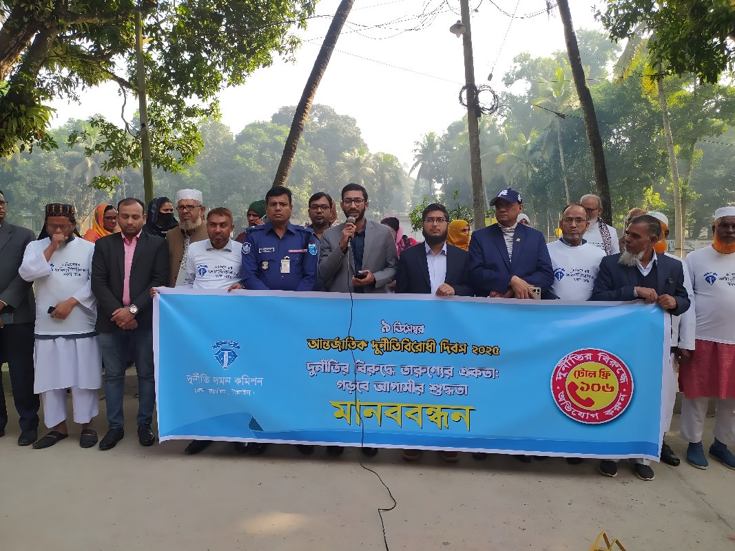 (সাজিদ পিয়াল)- গোপালপুরে আন্তর্জাতিক দুর্নীতিবিরোধী দিবস উপলক্ষে মানববন্ধন ও আলোচনা সভা অনুষ্ঠিত। টাঙ্গাইলের গোপালপুরে আন্তর্জাতিক দুর্নীতিবিরোধী দিবস উপলক্ষে মানববন্ধন ও আলোচনা সভা অনুষ্ঠিত হয়েছে। দুর্নীতির বিরুদ্ধে তারুণ্যের একতা, গড়বে আগামীর শুদ্ধতা—এই প্রতিপাদ্যে সোমবার (৯ ডিসেম্বর) সকালে দুর্নীতি দমন কমিশন (দুদক) টাঙ্গাইল কার্যালয় ও গোপালপুর উপজেলা দুর্নীতি প্রতিরোধ কমিটির যৌথ আয়োজনে উপজেলা পরিষদ চত্বরে মানববন্ধন কর্মসূচি পালন করা হয়। পরে উপজেলা হলরুমে অনুষ্ঠিত হয় আলোচনা সভা। আলোচনা সভায় গোপালপুর উপজেলা দুর্নীতি প্রতিরোধ কমিটির সভাপতি মো. হারুন-অর-রশিদের সভাপতিত্বে প্রধান অতিথি হিসেবে উপস্থিত ছিলেন ভারপ্রাপ্ত উপজেলা নির্বাহী কর্মকর্তা ও উপজেলা সহকারী কমিশনার (ভূমি) মো. নবাব আলী। বিশেষ অতিথি ছিলেন গোপালপুর থানার নবাগত অফিসার ইনচার্জ (ওসি) মো. আনোয়ার হোসেন। সভা সঞ্চালনা করেন উপজেলা দুর্নীতি প্রতিরোধ কমিটির সাধারণ সম্পাদক বদিউজ্জামান সিকদার। অনুষ্ঠানে বক্তব্য রাখেন উপজেলা প্রাণিসম্পদ কর্মকর্তা গোলাম মোর্শেদ, উপজেলা মৎস্য কর্মকর্তা সৌরভ কুমার দে, মাধ্যমিক শিক্ষা কর্মকর্তা নজরুল ইসলাম, মাধ্যমিক শিক্ষক সমিতির সভাপতি জুবায়েরুল হক, গোপালপুর প্রেসক্লাবের সম্পাদক অটল শরিয়ত উল্লাহ, সূতী ভিএম সরকারি উচ্চ বিদ্যালয়ের ভারপ্রাপ্ত প্রধান শিক্ষক আতিকুর রহমান, উপজেলা অবসর কল্যাণ সমিতির সভাপতি আহমেদ আলী ও সাধারণ সম্পাদক ওয়াহেদ উদ্দিন, লাইটহাউজ স্কুলের অধ্যক্ষ হাবিবুর রহমান তালুকদারসহ বিভিন্ন শ্রেণি-পেশার প্রতিনিধিরা। বক্তারা দিবসটির তাৎপর্য তুলে ধরে বলেন, দুর্নীতির বিরুদ্ধে কার্যকর সামাজিক প্রতিরোধ গড়ে তুলতে সর্বস্তরের মানুষের সচেতনতা অপরিহার্য। বিশেষ করে তরুণ প্রজন্মকে সম্পৃক্ত করে নৈতিকতা ও স্বচ্ছতার চর্চা জোরদার করতে হবে। দুর্নীতিমুক্ত সমাজ গঠনে সবাইকে ঐক্যবদ্ধভাবে কাজ করার আহ্বান জানান তারা।