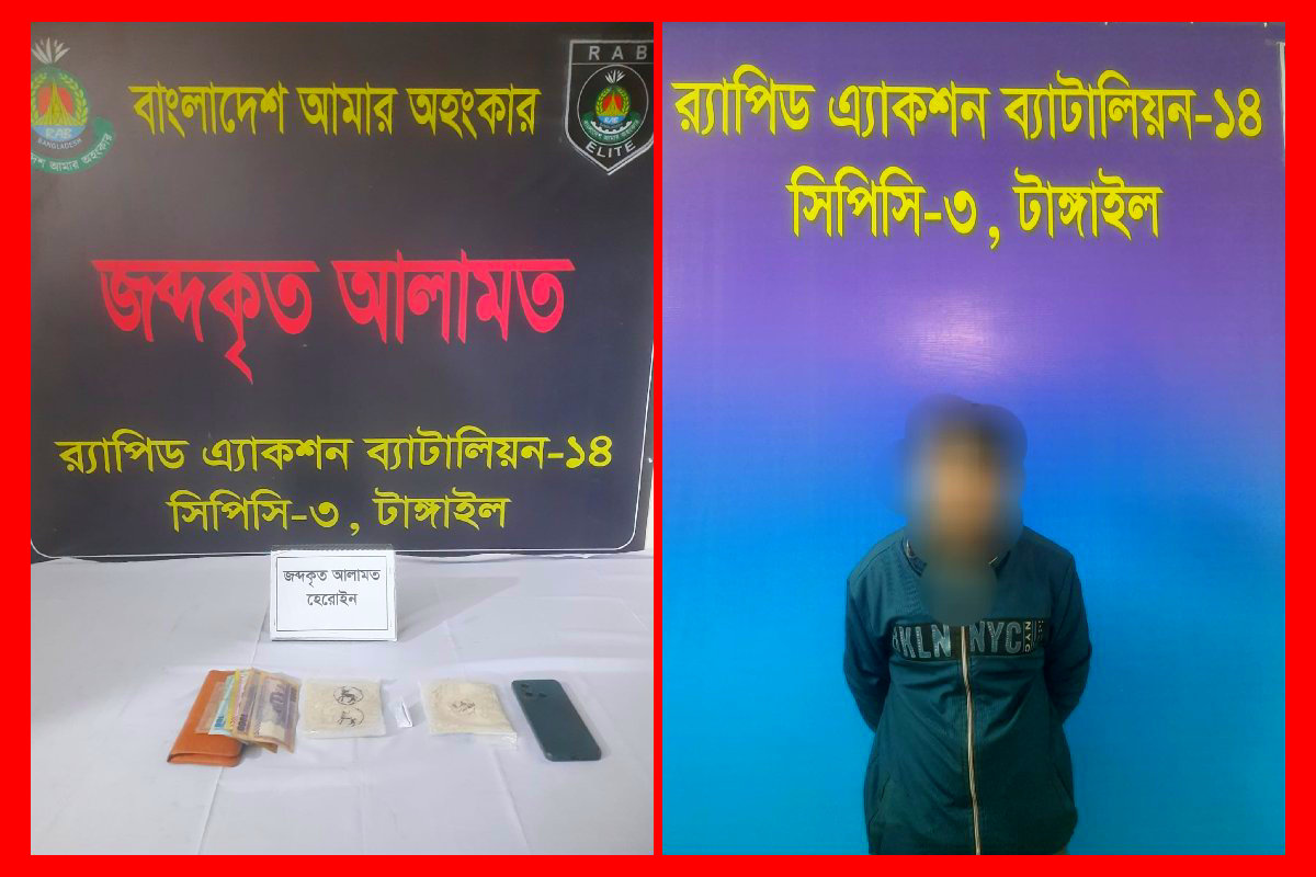 ঘাটাইলে র্যাবের চেকপোস্টে ১৩১ গ্রাম হেরোইনসহ মাদক কারবারি গ্রেফতার টাঙ্গাইলের ঘাটাইল উপজেলায় র্যাব-১৪-এর একটি বিশেষ অভিযানে বিপুল পরিমাণ অবৈধ মাদকদ্রব্য হেরোইনসহ এক মাদক কারবারিকে গ্রেফতার করা হয়েছে। উদ্ধারকৃত হেরোইনের আনুমানিক বাজারমূল্য প্রায় ১৩ লাখ ১০ হাজার টাকা বলে জানিয়েছে র্যাব।র্যাব সূত্র জানায়, গোপন সংবাদের ভিত্তিতে বুধবার (৪ ফেব্রুয়ারি ২০২৬) বিকেল সাড়ে পাঁচটার দিকে র্যাব-১৪-এর সিপিসি-৩, টাঙ্গাইল ক্যাম্পের একটি আভিযানিক দল ঘাটাইল থানার টাঙ্গাইল-জামালপুর আঞ্চলিক সড়কের দক্ষিণাশ্বর এলাকায় ব্রাহ্মণ শাসন মন্দিরের সামনে পাকা সড়কে একটি চেকপোস্ট স্থাপন করে। এ সময় জামালপুর অভিমুখী ‘সীমান্ত’ নামক একটি যাত্রীবাহী বাসে তল্লাশি চালিয়ে রাজশাহী জেলার বাসিন্দা মোঃ তৌফিক আহমেদ (৩২) নামের এক ব্যক্তিকে সন্দেহজনকভাবে আটক করা হয়। পরে উপস্থিত সাক্ষীদের সামনে তার দেহ তল্লাশি করে পরিহিত প্যান্টের পকেট থেকে ১ গ্রাম হেরোইন উদ্ধার করা হয়।পরবর্তীতে আরও গভীর তল্লাশির একপর্যায়ে অভিযুক্ত ব্যক্তি বিশেষ কৌশলে পায়ুপথে লুকিয়ে রাখা অতিরিক্ত ১৩০ গ্রাম হেরোইন বহন করছিলেন বলে নিশ্চিত হয় র্যাব। এ সময় হেরোইন ক্রয়-বিক্রয়ের সঙ্গে সংশ্লিষ্ট নগদ ২ হাজার ৪৯০ টাকা এবং একটি মোবাইল ফোনও জব্দ করা হয়।র্যাব জানায়, উদ্ধারকৃত মোট ১৩১ গ্রাম হেরোইনের আনুমানিক বাজারমূল্য প্রায় ১৩ লাখ ১০ হাজার টাকা। গ্রেফতারকৃত আসামির বিরুদ্ধে মাদকদ্রব্য নিয়ন্ত্রণ আইনে পরবর্তী আইনগত ব্যবস্থা গ্রহণের জন্য উদ্ধারকৃত আলামতসহ তাকে ঘাটাইল থানায় হস্তান্তর করা হয়েছে।র্যাব-১৪-এর পক্ষ থেকে জানানো হয়, মাদক নির্মূলে এ ধরনের অভিযান অব্যাহত থাকবে এবং মাদক কারবারিদের কোনোভাবেই ছাড় দেওয়া হবে না।