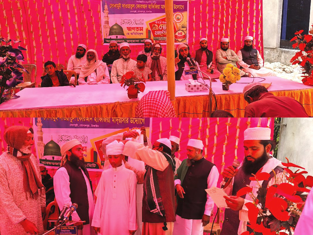 গোপালপুরে সোনামুই দাওয়াতুল কোরআন হাফিজিয়া মাদ্রাসায় জাঁকজমকপূর্ণ পাগড়ী প্রদান অনুষ্ঠান পবিত্র কোরআনের আলোকে আলোকিত প্রজন্ম গড়ে তোলার প্রত্যয়ে টাঙ্গাইলের গোপালপুর উপজেলার ঝাওয়াইল ইউনিয়নের সোনামুই দক্ষিণ পাড়ায় অবস্থিত ঐতিহ্যবাহী দাওয়াতুল কোরআন হাফিজিয়া মাদ্রাসার উদ্যোগে কোরআনে হাফেজ সম্পন্নকারী শিক্ষার্থীদের পাগড়ী প্রদান অনুষ্ঠান অত্যন্ত ধর্মীয় ভাবগাম্ভীর্য আবেগঘন ও উৎসবমুখর পরিবেশে অনুষ্ঠিত হয়েছে। মঙ্গলবার (২০ জানুয়ারি ২০২৬) সকাল ১০টা থেকে মাদ্রাসা প্রাঙ্গণে অনুষ্ঠিত এ অনুষ্ঠানে এলাকাবাসী অভিভাবক ও ধর্মপ্রাণ মুসল্লিদের স্বতঃস্ফূর্ত অংশগ্রহণে পুরো প্রাঙ্গণ পরিণত হয় এক পবিত্র মিলনমেলায়। দীর্ঘ সময় ধরে কোরআন মুখস্থ করে হাফেজ হওয়া শিক্ষার্থীদের সম্মাননা প্রদানই ছিল এ আয়োজনের প্রধান লক্ষ্য। অনুষ্ঠানের শুরুতে পবিত্র কোরআন তেলাওয়াতের মাধ্যমে কার্যক্রমের শুভ সূচনা করা হয়। এরপর একে একে ইসলামিক নসিহত কোরআন ও হাদিসের আলোকে গুরুত্বপূর্ণ আলোচনা এবং দিকনির্দেশনামূলক বক্তব্য প্রদান করা হয়। আলোচনায় বক্তারা বলেন কোরআনের হাফেজরা শুধু ব্যক্তি হিসেবে সম্মানিত নন তারা সমাজ ও জাতির জন্য এক অনন্য সম্পদ। কোরআন বুকে ধারণকারীরা আল্লাহ তায়ালার বিশেষ অনুগ্রহপ্রাপ্ত বান্দা এবং তারা কিয়ামতের দিনও বিশেষ মর্যাদার অধিকারী হবেন। বক্তারা আরও বলেন বর্তমান সমাজে নৈতিক অবক্ষয় ও মূল্যবোধের সংকট থেকে উত্তরণের জন্য কোরআনি শিক্ষার বিকল্প নেই। হাফেজে কোরআনরা তাদের জীবনাচরণ ও চরিত্রের মাধ্যমে সমাজে সততা ন্যায়পরায়ণতা ও মানবিকতা প্রতিষ্ঠায় গুরুত্বপূর্ণ ভূমিকা রাখতে পারে। তাই কোরআনের শিক্ষা শুধু মুখস্থের মধ্যেই সীমাবদ্ধ না রেখে বাস্তব জীবনে প্রতিফলনের ওপর গুরুত্বারোপ করেন তারা। হাফেজ শিক্ষার্থীদের উদ্দেশ্যে বক্তারা বলেন কোরআনের আলোকে নিজেদের জীবন পরিচালনা করতে হবে এবং সমাজের সর্বস্তরে ইসলামের সৌন্দর্য তুলে ধরতে হবে। একজন হাফেজ যেন আদর্শ মানুষ হিসেবে সমাজে নিজেকে প্রতিষ্ঠিত করতে পারে—এটাই হওয়া উচিত তাদের জীবনের মূল লক্ষ্য। অনুষ্ঠানে মাদ্রাসার মুহতামিম শিক্ষকবৃন্দ স্থানীয় আলেম-ওলামা মসজিদের খতিব এলাকার গণ্যমান্য ব্যক্তি অভিভাবকবৃন্দ এবং বিপুলসংখ্যক ধর্মপ্রাণ মুসল্লি উপস্থিত ছিলেন। অনুষ্ঠানের সবচেয়ে আবেগঘন মুহূর্ত ছিল হাফেজ শিক্ষার্থীদের মাথায় পাগড়ী পরিয়ে দেওয়ার আনুষ্ঠানিক পর্ব। এ সময় অভিভাবকদের চোখে আনন্দাশ্রু এবং উপস্থিত মুসল্লিদের মাঝে উচ্ছ্বাস লক্ষ্য করা যায়। অনুষ্ঠান শেষে দেশ জাতি ও সমগ্র মুসলিম উম্মাহর শান্তি সমৃদ্ধি ও কল্যাণ কামনায় বিশেষ দোয়া ও মোনাজাত পরিচালনা করা হয়