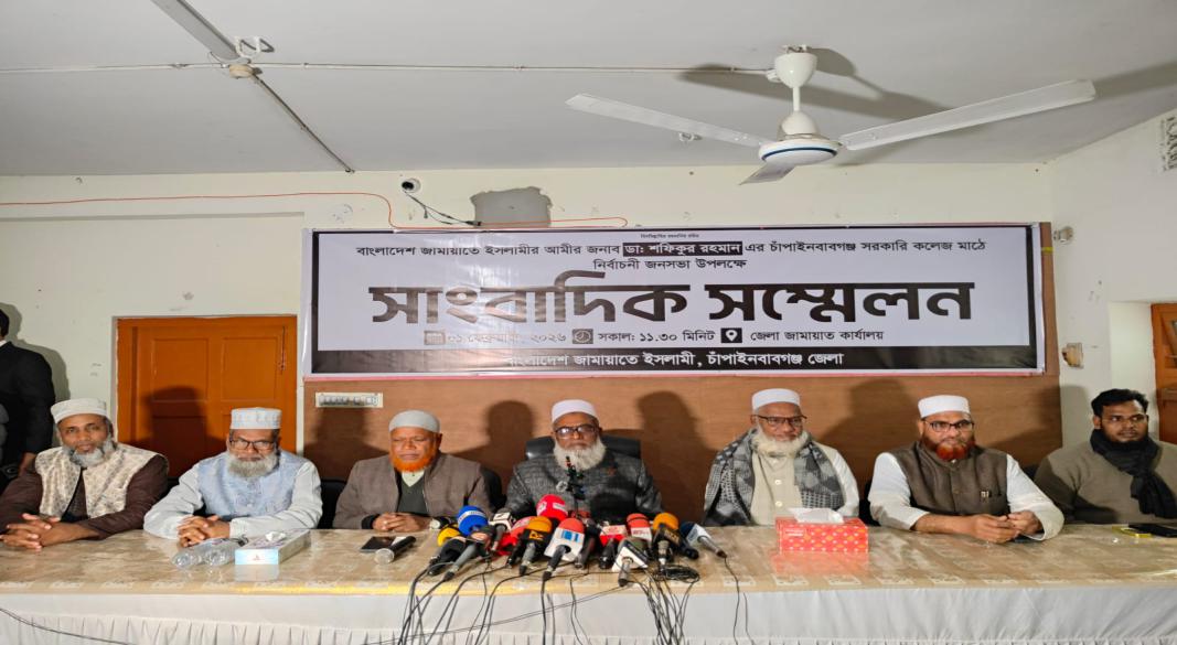 বাংলাদেশ জামায়াতে ইসলামীর আমীর জনাব ডা. শফিকুল রহমানের চাঁপাইনবাবগঞ্জ সরকারি কলেজ মাঠে অনুষ্ঠিতব্য নির্বাচনী জনসভা উপলক্ষে সাংবাদিক সম্মেলন অনুষ্ঠিত হয়েছে। রবিবার (১ ফেব্রুয়ারি) সকাল সাড়ে ১১টায় জেলা জামায়াতে ইসলামীর কার্যালয়ের কনফারেন্স রুমে এ সাংবাদিক সম্মেলনের আয়োজন করা হয়। সাংবাদিক সম্মেলনে জানানো হয়, আগামী ১২ ফেব্রুয়ারি অনুষ্ঠিতব্য ত্রয়োদশ জাতীয় সংসদ নির্বাচনকে সামনে রেখে বাংলাদেশ জামায়াতে ইসলামী ‘জুলাই সনদ’ বাস্তবায়ন, দুর্নীতি ও চাঁদাবাজমুক্ত দেশ গঠন, যুবকদের কর্মসংস্থান সৃষ্টি এবং একটি বৈষম্যমুক্ত কল্যাণরাষ্ট্র প্রতিষ্ঠার লক্ষ্যে নির্বাচনে অংশগ্রহণ করেছে। নেতৃবৃন্দ বলেন, আল্লাহর সাহায্য ও জনগণের ম্যান্ডেট নিয়ে বাংলাদেশ জামায়াতে ইসলামী আগামী দিনে সরকার গঠন করতে চায়। এ সময় তারা আরও বলেন, একটি অবাধ, সুষ্ঠু ও নিরপেক্ষ নির্বাচন নিশ্চিত করতে সিভিল প্রশাসন, পুলিশ প্রশাসন, সেনাবাহিনী, র্যাব, গোয়েন্দা বিভাগ, আইনজীবী, সাংবাদিকসহ সমাজের সর্বস্তরের মানুষের সহযোগিতা প্রত্যাশা করে বাংলাদেশ জামায়াতে ইসলামী।