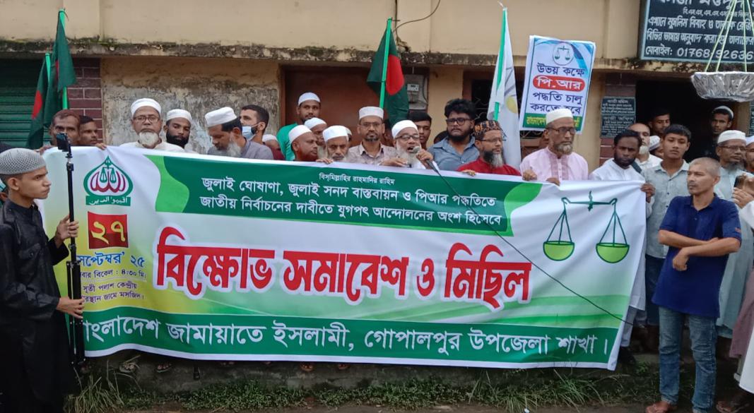 আইনি ভিত্তি সহ জুলাই সনদ বাস্তবায়ন, লেভেল প্লেইং ফিল্ড তৈরি এবং পিআর (Proportional Representation) পদ্ধতিতে জাতীয় নির্বাচনসহ ৫ দফা দাবিতে বিক্ষোভ মিছিল ও সমাবেশ করেছে বাংলাদেশ জামায়াতে ইসলামী গোপালপুর উপজেলা শাখা।