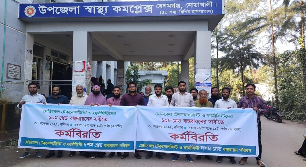 সারাদেশে ন্যায় নোয়াখালীর বেগমগঞ্জে মেডিকেল টেকনোলজিস্ট ও ফার্মাসিস্টদের ১০ম গ্রেড বাস্তবায়নের দাবীতে কর্মবিরতি পালন করা হয়েছে।