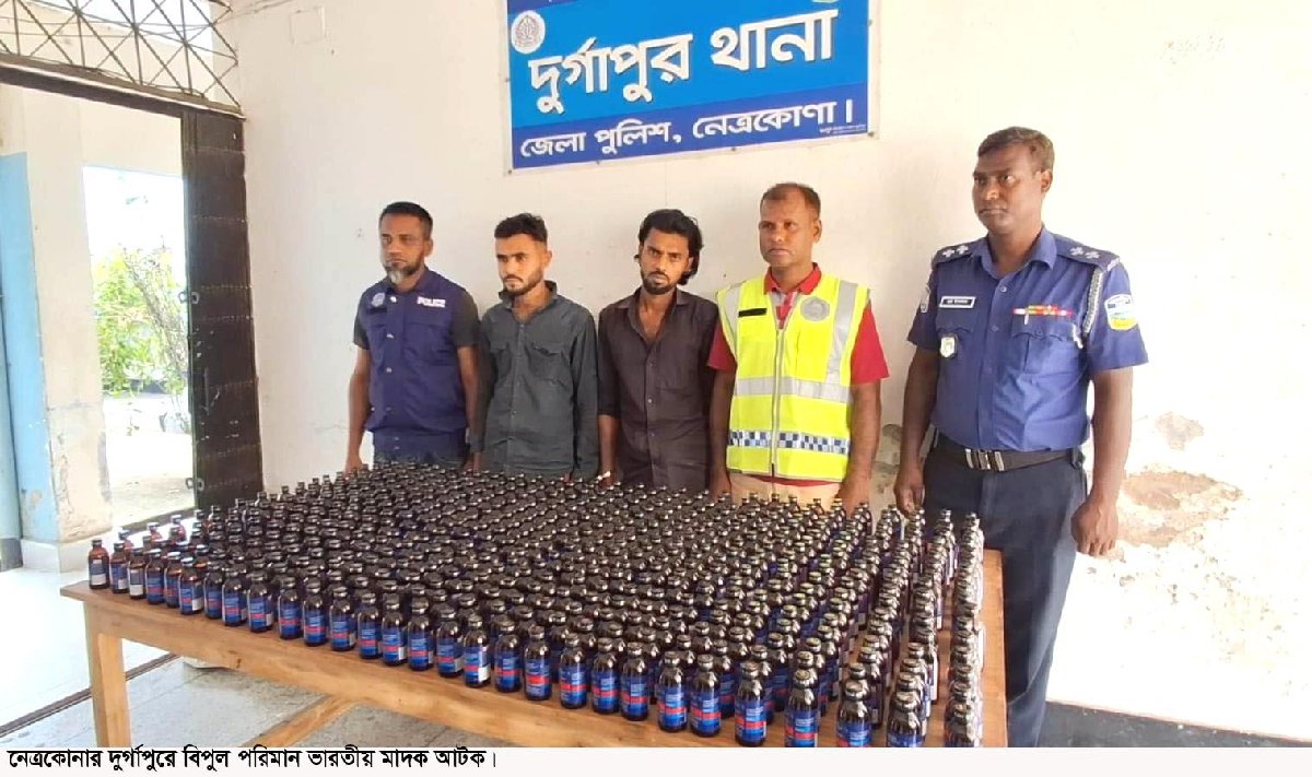 নেত্রকোনার দুর্গাপুরে অভিযান চালিয়ে ৬০০ বোতল ভারতীয় ফেন্সিডিলসদৃশ্য মাদক ‘ফেয়ারডিল’ সহ দুই মাদক কারবারিকে আটক করেছে পুলিশ। সোমবার (১৩ এপ্রিল) দুপুরে সাংবাদিকদের এ তথ্য নিশ্চিত করেছেন থানার ওসি মো. কামরুল হাসান। এর আগে, ওইদিন ভোরে পৌর শহরের বুরুঙ্গা ভাঙাব্রীজ এলাকায় এ অভিযান পরিচালনা করা হয়। আটককৃতরা হলেন, দুর্গাপুর উপজেলার চারিয়া মাসকান্দা গ্রামের আব্দুল আউয়ালের ছেলে মো. নাসির উদ্দিন (২৮) এবং একই গ্রামের তারা মিয়ার ছেলে মো. আলী আকবর (২৫)। পুলিশ জানায়, মাদকদ্রব্য পাচারের গোপন সংবাদের ভিত্তিতে পুলিশের একটি দল বুরুঙ্গা ভাঙাব্রীজ সংলগ্ন এলাকায় অভিযান পরিচালনা করা হয়। এ সময় পুলিশের উপস্থিতি টের পেয়ে ওই দুই মাদক কারবারি পালানোর চেষ্টা করলে পুলিশ ধাওয়া দিয়ে তাদের আটক করে। পরে তল্লাশি চালিয়ে তাদের হেফাজতে থাকা চার বস্তায় ৬০০ বোতল ভারতীয় মাদক ‘ফেয়ারডিল’ জব্দ করা হয়, যার বাজার মূল্য প্রায় ২৪ লাখ টাকা। এ ব্যাপারে দুর্গাপুর থানার ভারপ্রাপ্ত কর্মকর্তা (ওসি) মো. কামরুল হাসান বলেন, প্রাথমিক জিজ্ঞাসাবাদে আমরা জানতে পেরেছি তারা মাদক ব্যবসায়ী। তাদের সঙ্গে আরও বড় একটি চক্র জড়িত রয়েছে। তারা এসব মাদকদ্রব্য এখান থেকে ময়মনসিংহসহ ঢাকার বিভিন্ন এলাকায় পাচার করে আসছিল। তাদের বিরুদ্ধে মামলা দায়ের করে আদালতে সোপর্দ করার কার্যক্রম প্রক্রিয়াধীন। তিনি আরও বলেন, জেলা পুলিশ সুপার মহোদয়ের নির্দেশনায় সীমান্তবর্তী এই এলাকায় মাদকবিরোধী অভিযান ও চেকপোস্ট কার্যক্রম অব্যাহত রয়েছে। এ ব্যাপারে কাউকে ছাড় দেয়া হবে না।