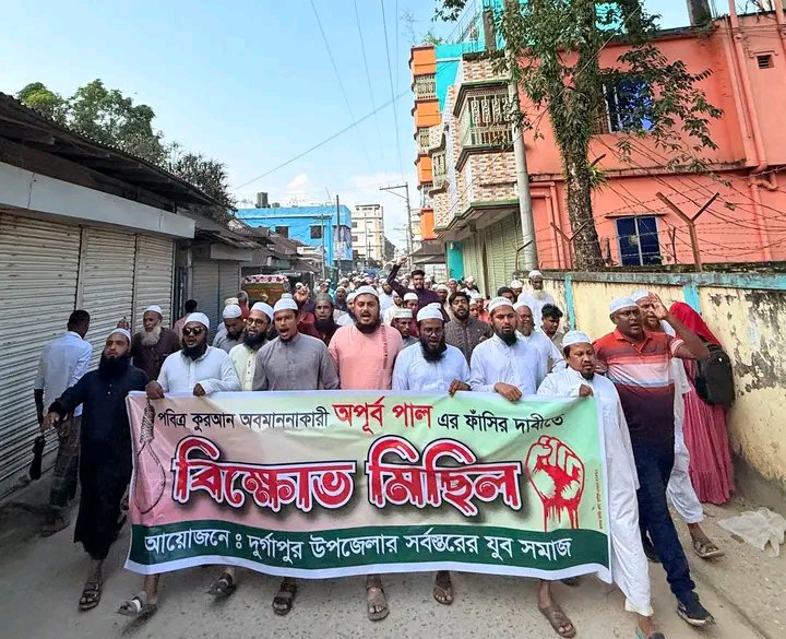 নেত্রকোনা দুর্গাপুরে কুরআন অবমাননাকারি অপূর্ব পালের ফাঁসির দাবীতে বিক্ষোভ মিছিল নর্থ সাউথ ইউনিভার্সিটির শিক্ষার্থী অপূর্ব পাল ধর্ম নিয়ে কটূক্তি এবং পবিত্র কুরআন অবমাননার প্রতিবাদে নেত্রকোনার দুর্গাপুরে বিক্ষোভ সমাবেশ ও মিছিল অনুষ্ঠিত হয়েছে। বুধবার (০৮ অক্টোবর) বিকেলে দুর্গাপুর উপজেলার সর্বস্তরের যুবসমাজের আয়োজনে এই বিক্ষোভ সমাবেশ ও মিছিল অনুষ্ঠিত হয়। বিক্ষোভ সমাবেশ ও মিছিলে বক্তারা বলেন, আমরা ৯০ শতাংশ মুসলমানদের দেশে বসবাস করি। এর পরও এই দেশে সম্প্রীতি নস্ট করার জন্য, বারবার অন্য ধর্মের লোকেরাই আল কুরআন অবমাননার ঘটনা ঘটাচ্ছে। আমরা কুরআন অবমাননাকারী অপুর্ব পালের ফাঁসি চাই। এই দেশে আর কেউ পবিত্র কুরআন অবমাননা করুক আমরা তা চাই না, কুরআনকে নিয়ে কটুক্তি করুক আমরা আর শুনতে চাইনা। সমাবেশে মুফতি নুরে আলমের সভাপতিত্বে এবং জামাল উদ্দীন কারিমী‘র সঞ্চালনায়, অন্যদের মাঝে বক্তব্য রাখেন, মুফতি সাব্বির আহমেদ, যুবদল নেতা আল ইমরান সম্রাট গণি, মুফতি রেজাউল করীম, মুফতি বরকত উল্লাহ্, মাওলানা ইমরান। আলোচনা শেষে দোয়া পরিচালনা করেন, মাওলানা মঞ্জুরুল হক।
