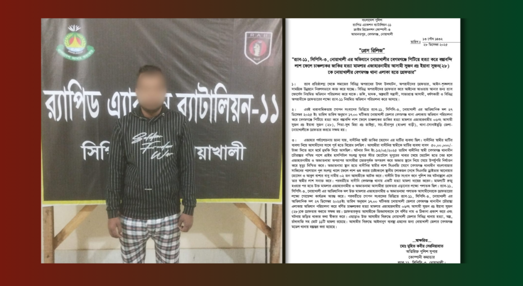 র্যাব-১১ নোয়াখালীর বেগমগঞ্জে অভিযানে বেগমগঞ্জে পিটিয়ে হত্যা করে বস্তাবন্দি লাশ ফেলে চাঞ্চল্যকর জাকির হত্যা মামলার এজাহারনামীভুক্ত আসামী ইয়াবা সুজন (২৮) গ্রেফতার করেছে। গ্রেফতার সুজন সোনাইমুড়ি উপজেলার হীরাপুর গ্রামের হাওলা বাড়ীর সুখ মিয়ার ছেলে।