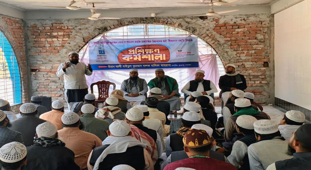 নুরানী তালিমুল কুরআন বোর্ড বাংলাদেশ কর্তৃক মাদরাসার উস্তাদদের জন্য শিক্ষাদান পদ্ধতি বিষয়ক এক প্রশিক্ষণ কর্মশালা অনুষ্ঠিত হয়েছে। বৃহস্পতিবার (২২ জানুয়ারি) সকাল ১০টা থেকে বিকাল ৪টা পর্যন্ত টাঙ্গাইলের ভূঞাপুর উপজেলার মাদারিয়া এলাকায় অবস্থিত ইমাম আলী বাইতুল কুরআন বালক-বালিকা মাদরাসার হলরুমে এ কর্মশালা অনুষ্ঠিত হয়। কর্মশালায় প্রধান আলোচক হিসেবে উপস্থিত ছিলেন মাওলানা আব্দুস সাত্তার কাসেমী। প্রশিক্ষক হিসেবে আরও উপস্থিত ছিলেন মাওলানা ইমরান আহমেদ ও হাফেজ হোসাইন আহমেদ। এছাড়া অতিথি হিসেবে উপস্থিত ছিলেন মাওলানা নুরুল ইসলাম, শেখ মাহদী হাসান শিবলী, মাওলানা সানোয়ার এবং মুফতি রবিউল ইসলাম। কর্মশালায় বিভিন্ন এলাকার ১৫টি মাদরাসা থেকে মোট ১২০ জন শিক্ষক অংশগ্রহণ করেন। প্রশিক্ষণে নুরানী শিক্ষাব্যবস্থায় আধুনিক ও কার্যকর পাঠদান কৌশল, শিক্ষার্থীবান্ধব পরিবেশ সৃষ্টি এবং মানসম্মত কুরআন শিক্ষার বিভিন্ন দিক নিয়ে গুরুত্বপূর্ণ আলোচনা করা হয়। আয়োজকরা জানান, এ ধরনের প্রশিক্ষণ কর্মশালা শিক্ষকদের দক্ষতা ও যোগ্যতা বৃদ্ধিতে গুরুত্বপূর্ণ ভূমিকা রাখবে এবং এর মাধ্যমে নুরানী শিক্ষার মান আরও সমৃদ্ধ হবে বলে তারা আশাবাদ ব্যক্ত করেন।
