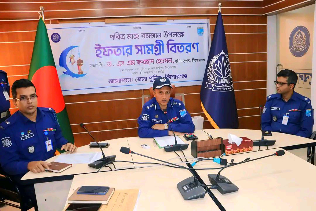 পবিত্র মাহে রমজান উপলক্ষে ইফতার সামগ্রী বিতরণ ২৪ ফেব্রুয়ারি ২০২৬ খ্রি তারিখে মিডিয়া সেল জেলা পুলিশ কিশোরগঞ্জ পবিত্র মাহে রমজানের তাৎপর্যকে সামনে রেখে মানবিক ও সামাজিক দায়বদ্ধতার অংশ হিসেবে কিশোরগঞ্জ জেলা পুলিশের উদ্যোগে ইফতার সামগ্রী বিতরণ কর্মসূচি অনুষ্ঠিত হয়েছে।অদ্য ২৪/০২/২০২৬ খ্রি.বিকাল ৩:০০ ঘটিকায় জেলা পুলিশের সম্মেলন কক্ষে আয়োজিত এ কর্মসূচিতে সভাপতিত্ব করেন কিশোরগঞ্জ জেলার সুযোগ্য পুলিশ সুপার ড. এস. এম ফরহাদ হোসেন। তাঁর সার্বিক দিকনির্দেশনায় এ মানবিক উদ্যোগ বাস্তবায়িত হয়।অনুষ্ঠানে উপস্থিত ছিলেন অতিরিক্ত পুলিশ সুপার (অর্থ ও প্রশাসন) অতিরিক্ত পুলিশ সুপার (ক্রাইম অ্যান্ড অপস্) অতিরিক্ত পুলিশ সুপার (বাজিতপুর সার্কেল) সহকারী পুলিশ সুপার (ভৈরব সার্কেল)সহ কিশোরগঞ্জ জেলা পুলিশের সকল সিনিয়র কর্মকর্তা।সভাপতির বক্তব্যে পুলিশ সুপার বলেন রমজান মাস আত্মশুদ্ধি সহমর্মিতা ও ত্যাগের শিক্ষা দেয়। সমাজের অসহায় ও নিম্নআয়ের মানুষের পাশে দাঁড়ানো পুলিশ বাহিনীর নৈতিক দায়িত্বের অংশ। তিনি এ ধরনের মানবিক কার্যক্রম ভবিষ্যতেও অব্যাহত রাখার আশাবাদ ব্যক্ত করেন। অনুষ্ঠান শেষে উপস্থিতদের মাঝে ইফতার সামগ্রী বিতরণ করা হয়। জেলা পুলিশের এ উদ্যোগকে সামাজিক সম্প্রীতি ও মানবিক মূল্যবোধ জাগ্রত করার একটি প্রশংসনীয় পদক্ষেপ হিসেবে অভিহিত করেছেন