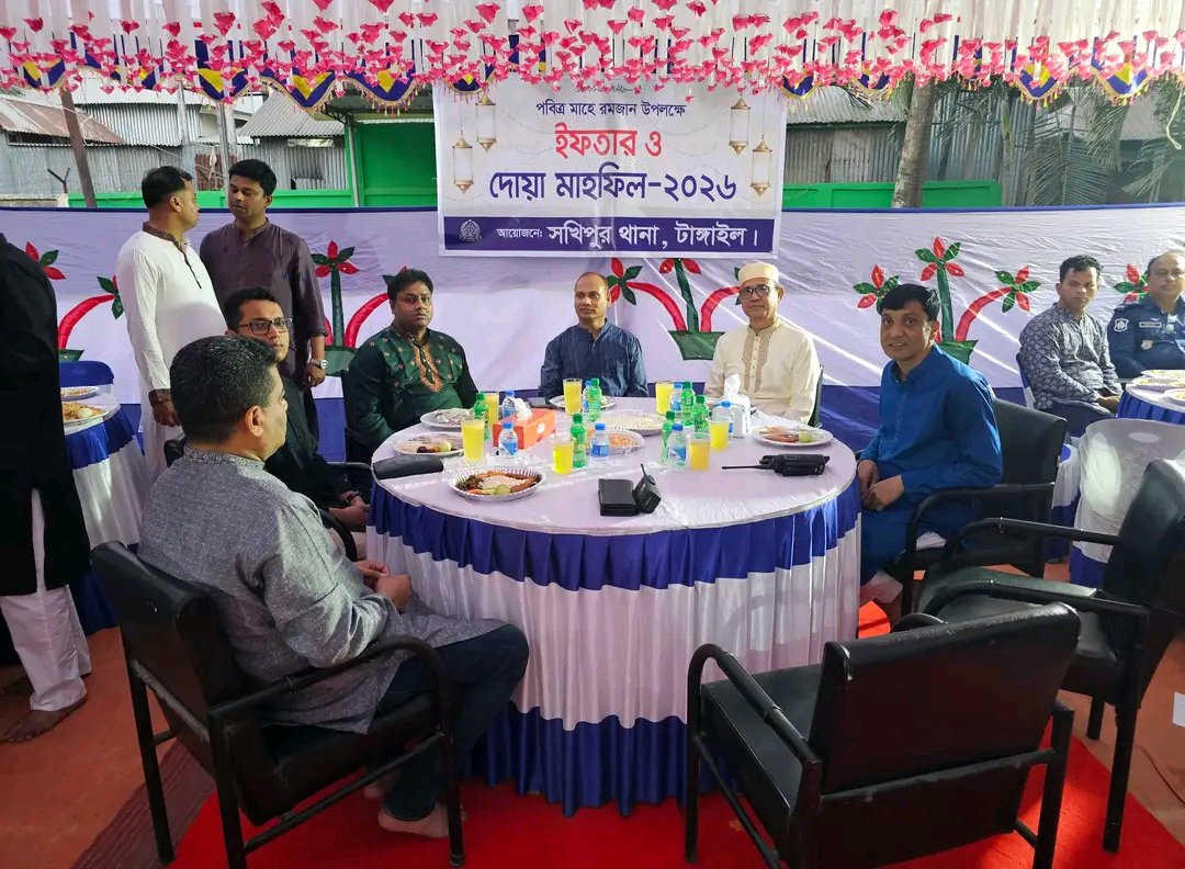 পবিত্র রমজান উপলক্ষে সখিপুর থানায় ইফতার ও দোয়া মাহফিল অনুষ্ঠিত পবিত্র রমজানুল মোবারক উপলক্ষে টাঙ্গাইলের সখিপুর থানায় ইফতার ও দোয়া মাহফিল অনুষ্ঠিত হয়েছে। বৃহস্পতিবার সখিপুর থানা প্রাঙ্গণে এ আয়োজন করা হয়।সখিপুর থানা টাঙ্গাইলের উদ্যোগে আয়োজিত এই ইফতার মাহফিলে প্রধান অতিথি হিসেবে উপস্থিত ছিলেন অতিরিক্ত পুলিশ সুপার (প্রশাসন ও অর্থ) জনাব মোঃ রবিউল ইসলাম, পিপিএম-সেবা। বিশেষ অতিথি হিসেবে উপস্থিত ছিলেন অতিরিক্ত পুলিশ সুপার (ডিএসবি) জনাব কাজী শাহনেওয়াজ পিপিএম-সেবা। ইফতার ও দোয়া মাহফিলে দেশ ও জাতির কল্যাণ বিশ্ব মুসলিম উম্মাহর শান্তি, সমৃদ্ধি এবং বাংলাদেশ পুলিশ সদস্যদের সুস্বাস্থ্য ও দীর্ঘায়ু কামনা করে বিশেষ দোয়া ও মোনাজাত করা হয়।অনুষ্ঠানে উপস্থিত ছিলেন সখিপুর সার্কেলের সহকারী পুলিশ সুপার জনাব এ.কে.এম মামুনুর রশীদ। এছাড়াও সখিপুর থানার অফিসার ইনচার্জসহ থানায় কর্মরত অন্যান্য পুলিশ কর্মকর্তা ও সদস্যরা উপস্থিত ছিলেন।ইফতার মাহফিল শেষে উপস্থিত অতিথিরা রমজানের তাৎপর্য তুলে ধরে পারস্পরিক সম্প্রীতি সহমর্মিতা ও দায়িত্বশীলতার সঙ্গে দায়িত্ব পালনের আহ্বান জানান।