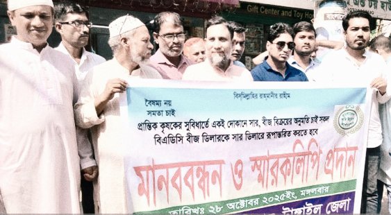 সাজিদ পিয়াল: কৃষকদের সুবিধার্থে একই দোকানে সার ও বীজ বিক্রয়ের অনুমতি প্রদানের দাবিতে মানববন্ধন ও স্মারকলিপি প্রদান করেছে টাংগাইল জেলা (BADC) বীজ ডিলাররা। ২৮ অক্টোবর মঙ্গলবার সকালে টাঙ্গাইল প্রেসক্লাবের সামনে বাংলাদেশ কৃষি উন্নয়ন করপোরেশনের (BADC) বীজ ডিলার টাঙ্গাইল জেলা শাখার উদ্যোগে এ মানববন্ধন কর্মসূচি পালিত হয়। এই মানববন্ধনে অংশ নেন টাংগাইল জেলার বিভিন্ন উপজেলার বীজ ডিলাররা। বক্তব্য রাখেন জেলা বীজ ডিলার অ্যাসোসিয়েশনের আহ্বায়ক মো. আরিফুর রহমান, যুগ্ম আহ্বায়ক বিপ্লব হোসেন এবং সদস্য সচিব গোলাম কিবরিয়া প্রমুখ। মানববন্ধন শেষে প্রধান উপদেষ্টার কাছে স্মারকলিপি এবং তাঁদের দাবি পাঠানোর জন্য জেলা প্রশাসকের মাধ্যমে স্মারকলিপি প্রদান করেন। উক্ত অনুষ্ঠানটিতে বক্তারা উল্লেখ্য করেন ২০১০ সালের নীতিমালা অনুযায়ী বীজ ডিলাররা এক বছর পর সার ডিলারে রূপান্তরিত হওয়ার সুযোগ পায়। কিন্তু দীর্ঘদিন ধরে সেই ডিলারশিপ না পাওয়ায় তারা ক্ষতিগ্রস্ত হচ্ছেন। একই দোকান থেকে যেন সার ও বীজ বিক্রির সুযোগ পেলে কৃষকরা এক জায়গায় সব কৃষি উপকরণ সংগ্রহ করতে পারবেন। এতে সময় ও খরচ দুইটিই বাঁচবে। আরও বলেন, ‘কৃষকের চাহিদা অনুযায়ী আমরা বিএডিসির মানসম্মত বীজ সরবরাহ করে আসছি। কৃষকের সুবিধার্থে বীজ ডিলারদের সার ডিলারশিপ দ্রুত বাস্তবায়ন করার আহ্বান জানানো হয়।