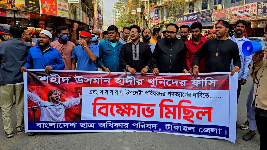 টাঙ্গাইলে ইনকিলাব মঞ্চের মুখ্য পাত্র ওসমান হাদীর ওপর হামলার প্রতিবাদে বিক্ষোভ সমাবেশ। ইনকিলাব মঞ্চের মুখ্য পাত্র ওসমান হাদীর ওপর সন্ত্রাসী হামলার প্রতিবাদে এবং সারাদেশে সাবেক শেখ হাসিনা সরকারের সংবিধান বিরোধী কার্যকলাপের বিরুদ্ধে টাঙ্গাইলে বিক্ষোভ সমাবেশ করেছে বৈষম্য বিরোধী ছাত্র আন্দোলন ও দলমত নির্বিশেষে সাধারণ জনগণ। ১৯ ডিসেম্বর ২০২৫ ইং শুক্রবার জুমার নামাজ শেষে টাঙ্গাইল কেন্দ্রীয় জামে মসজিদের সামনে থেকে একযোগে এই বিক্ষোভ মিছিল শুরু হয়। পরে মিছিলটি টাঙ্গাইল শহরের প্রধান প্রধান সড়ক প্রদক্ষিণ করে রাজপথে এক সংক্ষিপ্ত সমাবেশে রূপ নেয়।সমাবেশে শতশত মানুষ স্বতঃস্ফূর্তভাবে অংশগ্রহণ করেন। এতে শিক্ষার্থী, তরুণ সমাজ, বিভিন্ন শ্রেণি-পেশার মানুষ ও সচেতন নাগরিকদের উপস্থিতি লক্ষ্য করা যায়। বিক্ষোভকারীরা হামলার তীব্র নিন্দা জানিয়ে দোষীদের দ্রুত গ্রেপ্তার ও দৃষ্টান্তমূলক শাস্তির দাবি জানান।সমাবেশে বক্তারা বলেন ইনকিলাব মঞ্চের মুখ্য পাত্র ওসমান হাদীর ওপর হামলা গণতন্ত্র ও মতপ্রকাশের স্বাধীনতার ওপর সরাসরি আঘাত। এই হামলার বিচার ২৪ ঘণ্টার মধ্যে নিশ্চিত করতে হবে। অন্যথায় ছাত্র-জনতা এই অন্যায় কখনোই মেনে নেবে না তারা আরও বলেন, সারাদেশে চলমান সংবিধান বিরোধী কর্মকাণ্ড ও দমন-পীড়নের বিরুদ্ধে ছাত্র-জনতা ঐক্যবদ্ধভাবে রাজপথে অবস্থান নিতে বাধ্য হয়েছে। দাবি আদায় না হওয়া পর্যন্ত আন্দোলন চালিয়ে যাওয়ারও ঘোষণা দেন বক্তারা।সমাবেশ শেষে শান্তিপূর্ণভাবে কর্মসূচি শেষ হলেও পুরো এলাকাজুড়ে ছিল ব্যাপক জনসচেতনতা ও প্রতিবাদী স্লোগানের মুখর পরিবেশ।