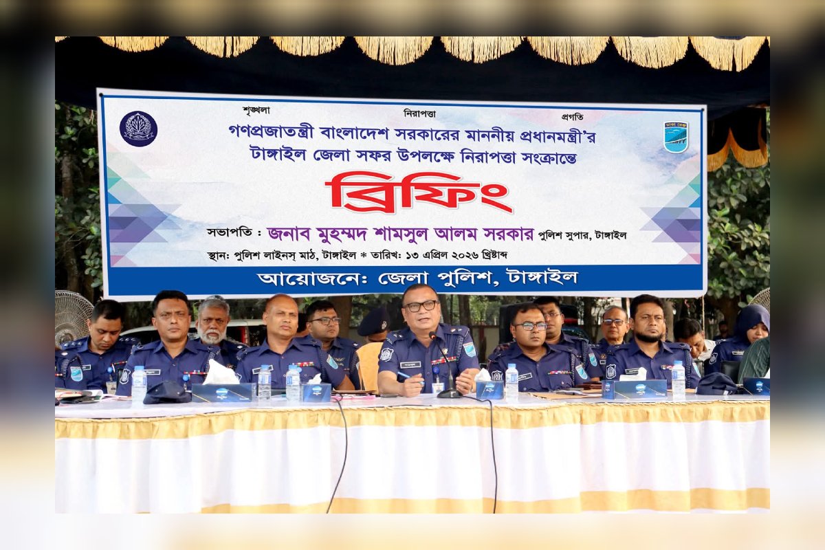 টাঙ্গাইলে প্রধানমন্ত্রী সফর উপলক্ষে নিরাপত্তা সংক্রান্ত ব্রিফিং অনুষ্ঠিত টাঙ্গাইল ১৩ এপ্রিল ২০২৬ ইং গণপ্রজাতন্ত্রী বাংলাদেশ সরকারের মাননীয় প্রধানমন্ত্রী’র টাঙ্গাইল জেলা সফরকে কেন্দ্র করে জেলা পুলিশের আয়োজনে নিরাপত্তা সংক্রান্ত বিশেষ ব্রিফিং অনুষ্ঠিত হয়েছে। ব্রিফিংটি জেলা পুলিশ লাইন্স মাঠে অনুষ্ঠিত হয়।ব্রিফিংয়ে সভাপতিত্ব করেন জনাব মুহম্মদ শামসুল আলম সরকার পুলিশ সুপার টাঙ্গাইল। পুলিশ সুপার মহোদয় বলেন মাননীয় প্রধানমন্ত্রীর সফরকে ঘিরে সার্বিক নিরাপত্তা ব্যবস্থা জোরদার করা হবে। সফরস্থলসহ আশপাশের গুরুত্বপূর্ণ এলাকা ও গুরুত্বপূর্ণ স্থানে পর্যাপ্ত সংখ্যক পুলিশ সদস্য মোতায়েন করা হবে। তিনি আরও বলেন ট্রাফিক ব্যবস্থাপনা গোয়েন্দা নজরদারি এবং সাদা পোশাকে নিরাপত্তা জোরদার করা হচ্ছে। এছাড়া ডিউটিতে নিয়োজিত সকল পুলিশ সদস্যকে সর্বোচ্চ সতর্কতা পেশাদারিত্ব ও আন্তরিকতার সঙ্গে দায়িত্ব পালনের নির্দেশনা প্রদান করা হয়েছে।ব্রিফিংয়ে উপস্থিত ছিলেন জনাব মোঃ রবিউল ইসলাম পিপিএম-সেবা অতিরিক্ত পুলিশ সুপার (প্রশাসন ও অর্থ) জনাব মোঃ আদিবুল ইসলাম পিপিএম-সেবা অতিরিক্ত পুলিশ সুপার (ক্রাইম অ্যান্ড অপস্) জনাব কাজী শাহনেওয়াজ পিপিএম-সেবা অতিরিক্ত পুলিশ সুপার (ডিএসবি) টাঙ্গাইলসহ সকল সার্কেল কর্মকর্তাগণ এবং ডিউটিতে নিয়োজিত পুলিশ অফিসার ও ফোর্সবৃন্দ।পুলিশ সুপার মহোদয় নিশ্চিত করেন প্রধানমন্ত্রী’র সফরের সময় জেলা পুলিশ সর্বোচ্চ সতর্কতা বজায় রেখে আইন-শৃঙ্খলা রক্ষায় সব ধরনের প্রস্তুতি সম্পন্ন রাখবে।
