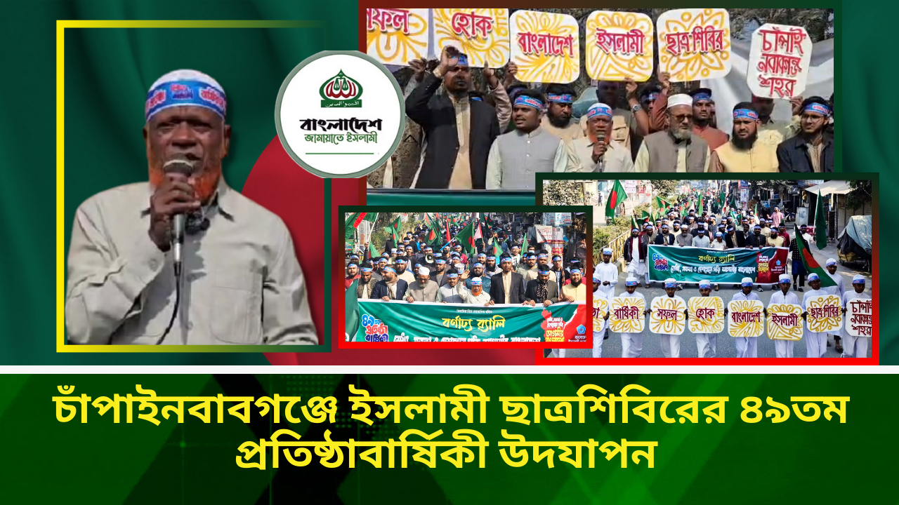 বাংলাদেশ ইসলামী ছাত্রশিবিরের ৪৯তম প্রতিষ্ঠাবার্ষিকী উপলক্ষে সংগঠনটির চাঁপাইনবাবগঞ্জ শহর শাখার উদ্যোগে এক বর্ণাঢ্য র্যালি ও সমাবেশ অনুষ্ঠিত হয়েছে। (৬ই ফেব্রুয়ারী) শুক্রবার সকাল ১০টায় চাঁপাইনবাবগঞ্জ পৌরসভা পার্ক থেকে র্যালি শুরু হয়। সেটি বাতেন খাঁ মোড় হয়ে শান্তি মোড় ও শিবতলা মোড় হয়ে রেহাইচর মোড়ে এসে সংক্ষিপ্ত সমাবেশের মাধ্যমে কর্মসূচি শেষ হয়। ‘মেধা, সততা ও দেশপ্রেমে গড়ি আগামীর বাংলাদেশ’ এ স্লোগান নিয়ে প্রতিষ্ঠাবার্ষিকী উদ্যাপন করেছে বাংলাদেশ ইসলামী ছাত্রশিবির চাঁপাইনবাবগঞ্জ শহর শাখা। র্যালি শেষে সংক্ষিপ্ত সমাবেশে বক্তব্য রাখেন ছাত্রশিবিরের কেন্দ্রীয় সাবেক সভাপতি ও চাঁপাইনবাবগঞ্জ-৩ আসনের জামায়াত মনোনীত প্রার্থী মোঃ নূরুল ইসলাম বুলবুল। মোঃ নূরুল ইসলাম বুলবুল বলেন, ছাত্রশিবির দেশের ছাত্রসমাজকে নৈতিকতা ও আদর্শিক শিক্ষায় গড়ে তুলতে গুরুত্বপূর্ণ ভূমিকা রেখে চলেছে। আগামীতেও এই ধারা অব্যাহত থাকবে ইনশাআল্লাহ। বিশেষ অতিথির বক্তব্য রাখেন, ছাত্রশিবিরের কেন্দ্রীয় কমিটির সাবেক আন্তর্জাতিক বিষয়ক সম্পাদক ও জামায়াতের কর্মপরিষদের সদস্য অধ্যক্ষ মোহাম্মদ নজরুল ইসলাম, ছাত্রশিবিরের জেলার সাবেক সভাপতি ও পৌর নায়েবে আমীর এ্যাডভোকেট মোঃ শফিক এনায়েতুল্লাহ। এসময় উপস্থিত ছিলেন, পৌর জামায়াতের আমীর হাফেজ গোলাম রাব্বানী, ইসলামী ছাত্রশিবির চাঁপাইনবাবগঞ্জ শহর শাখার সভাপতি মোঃ আব্দুল আজিজ, সম্পাদক মোঃ ইউসুফ আল গালিবসহ বিভিন্ন পর্যায়ের নেতৃবৃন্দ ও বিপুল সংখ্যক কর্মী উপস্থিত ছিলেন।
