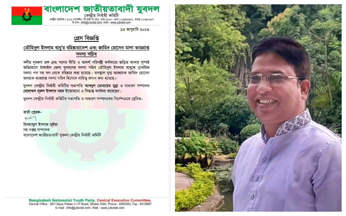 দলীয় শৃঙ্খলা ভঙ্গের অভিযোগে টাঙ্গাইল জেলা যুবদলের সদস্য সচিব বাবু বহিষ্কার দলীয় শৃঙ্খলা ভঙ্গ ও আদর্শ পরিপন্থি কর্মকাণ্ডে জড়িত থাকার অভিযোগে টাঙ্গাইল জেলা যুবদলের সদস্য সচিব তৌহিদুল ইসলাম বাবুকে প্রাথমিক সদস্য পদসহ দল থেকে বহিষ্কার করা হয়েছে। একই সঙ্গে তার স্থলে জেলা যুবদলের যুগ্ম আহ্বায়ক জাহিদ হোসেন মালাকে ভারপ্রাপ্ত সদস্য সচিব হিসেবে দায়িত্ব প্রদান করা হয়েছে। মঙ্গলবার (১৩ জানুয়ারি) যুবদলের কেন্দ্রীয় নির্বাহী কমিটির সহদপ্তর সম্পাদক মিনহাজুল ইসলাম ভূইয়ার স্বাক্ষরিত এক বিজ্ঞপ্তিতে এ তথ্য নিশ্চিত করা হয়।বিজ্ঞপ্তিতে উল্লেখ করা হয় সুস্পষ্ট অভিযোগের ভিত্তিতে দলীয় শৃঙ্খলা ভঙ্গ ও সংগঠনের আদর্শ পরিপন্থি কর্মকাণ্ডে জড়িত থাকার কারণে তৌহিদুল ইসলাম বাবুর বিরুদ্ধে এ সাংগঠনিক ব্যবস্থা গ্রহণ করা হয়েছে। একই সঙ্গে শূন্য পদে জাহিদ হোসেন মালাকে ভারপ্রাপ্ত সদস্য সচিব হিসেবে দায়িত্ব প্রদান করা হয়েছে।এতে আরও বলা হয় যুবদলের কেন্দ্রীয় নির্বাহী কমিটির সভাপতি আবদুল মোনায়েম মুন্না ও সাধারণ সম্পাদক মোহাম্মদ নূরুল ইসলাম নয়নের অনুমোদনে এ সিদ্ধান্ত ইতোমধ্যেই কার্যকর হয়েছে।যুবদলের কেন্দ্রীয় সূত্র জানায় আসন্ন ত্রয়োদশ জাতীয় সংসদ নির্বাচনে বিএনপির কেন্দ্রীয় নির্বাহী কমিটির প্রচার সম্পাদক এবং টাঙ্গাইল-৫ (সদর) আসনের দলীয় মনোনীত সংসদ সদস্য প্রার্থী সুলতান সালাউদ্দিন টুকুর বিপক্ষে অবস্থান নেন তৌহিদুল ইসলাম বাবু। দলীয় মনোনীত প্রার্থীর বিরুদ্ধে নির্বাচনী প্রচারণাসহ শৃঙ্খলাভঙ্গের একাধিক সুস্পষ্ট প্রমাণ পাওয়ায় তার বিরুদ্ধে কঠোর সাংগঠনিক ব্যবস্থা হিসেবে বহিষ্কারের সিদ্ধান্ত নেওয়া হয়। দলীয় সূত্র আরও জানায় ভবিষ্যতে দলীয় শৃঙ্খলা রক্ষায় এ ধরনের কর্মকাণ্ডের বিরুদ্ধে যুবদল কঠোর অবস্থানে থাকবে।