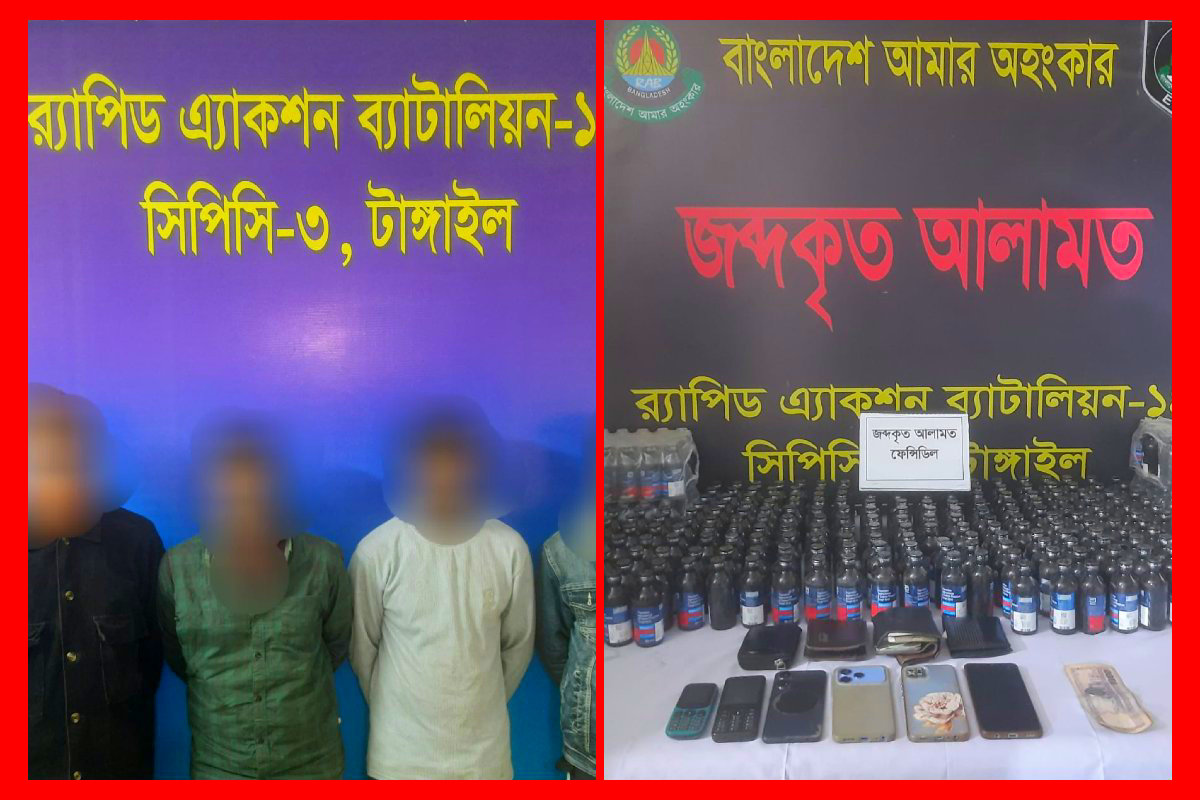 গাজীপুরে র্যাবের বড় অভিযান ৩৬৬ বোতল ফেন্সিডিলসহ চার মাদক ব্যবসায়ী আটক জব্দ করা হয়েছে মাইক্রোবাস, মোটরসাইকেল ও মোবাইল৫ ফেব্রুয়ারি ২০২৬ ইং তারিখে গাজীপুরের শ্রীপুর উপজেলায় র্যাপিড অ্যাকশন ব্যাটালিয়ন (র্যাব)-১৪ এর সিপিসি-৩, টাঙ্গাইল ক্যাম্পের অভিযানে বিপুল পরিমাণ অবৈধ মাদকদ্রব্য ফেন্সিডিল উদ্ধারসহ চারজন চিহ্নিত মাদক ব্যবসায়ীকে আটক করা হয়েছে। অভিযানে ৩৬৬ বোতল ফেন্সিডিল ছাড়াও একটি নোহা মাইক্রোবাস, একটি মোটরসাইকেল চারটি মোবাইল ফোন এবং মাদক বেচাকেনার নগদ অর্থ জব্দ করা হয়।র্যাব সূত্র জানায়, গোপন গোয়েন্দা তথ্যের ভিত্তিতে বৃহস্পতিবার (৫ ফেব্রুয়ারি ২০২৬) বিকেল আনুমানিক সাড়ে ৫টার দিকে গাজীপুর জেলার শ্রীপুর থানাধীন কেওয়া নতুন বাজার এলাকায় অভিযান পরিচালনা করা হয়। অভিযানে ইব্রাহিম বেডিংয়ের সামনে পাকা রাস্তা থেকে চার মাদক কারবারিকে আটক করা হয়।আটককৃতরা হলেন—মোঃ শহিদুল ইসলাম (৫৫), জেলা: ঠাকুরগাঁও;মোঃ হাদিল (৩৯), জেলা: গাজীপুর; মোঃ নওশাদ (২৯), জেলা: ঠাকুরগাঁও এবং মোঃ শহিদুল ইসলাম ওরফে জুয়েল (৩৩), জেলা: ঠাকুরগাঁও।আটকের পর উপস্থিত সাক্ষীদের সামনে প্রাথমিক জিজ্ঞাসাবাদে তারা তাদের নিয়ন্ত্রণাধীন একটি মাইক্রোবাসে ফেন্সিডিল বহনের কথা স্বীকার করে। পরে তাদের দেওয়া তথ্য অনুযায়ী মাইক্রোবাসের ভেতরে বিশেষ কৌশলে লুকিয়ে রাখা ৩৬৬ বোতল ফেন্সিডিল উদ্ধার করা হয়।র্যাব জানায়, উদ্ধারকৃত ফেন্সিডিলের আনুমানিক বাজারমূল্য প্রায় ১০ লাখ ৯৮ হাজার টাকা। একই সঙ্গে ব্যবহৃত নোহা মাইক্রোবাস, একটি মোটরসাইকেল, চারটি মোবাইল ফোন এবং নগদ তিন হাজার টাকা জব্দ করা হয়েছে।আটককৃতদের বিরুদ্ধে প্রয়োজনীয় আইনানুগ ব্যবস্থা গ্রহণের জন্য উদ্ধারকৃত আলামতসহ তাদের গাজীপুর জেলার শ্রীপুর থানায় হস্তান্তর করা হয়েছে। র্যাব-১৪ কর্তৃপক্ষ আরও জানায়, মাদক নির্মূলে চলমান অভিযান আরও জোরদার করা হবে এবং এ ধরনের অপরাধের সঙ্গে জড়িতদের বিরুদ্ধে কঠোর ব্যবস্থা অব্যাহত থাকবে।