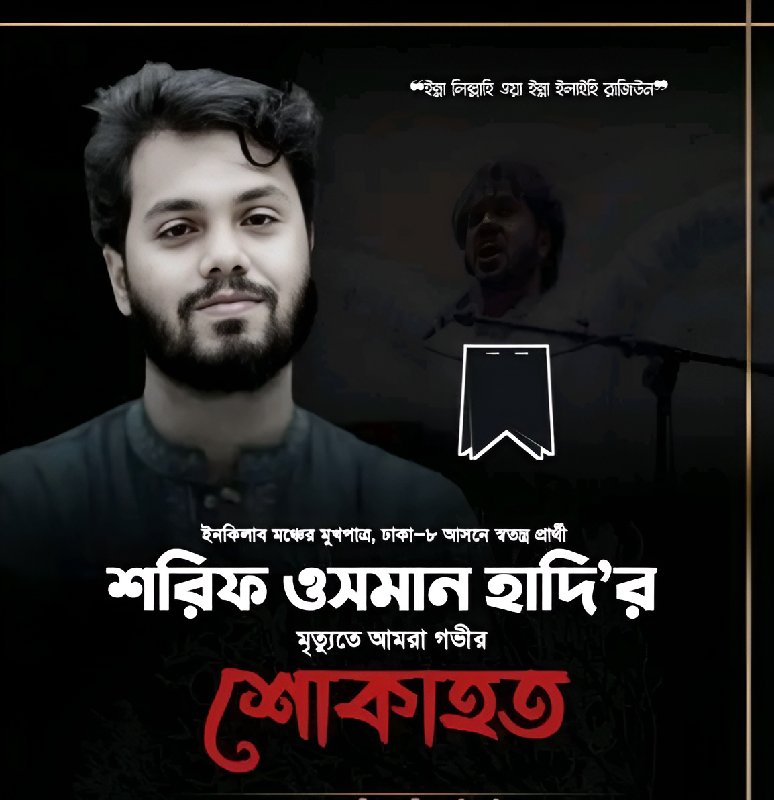 ইনকিলাব মঞ্চের মুখপাত্র শরিফ ওসমান হাদি’র ইন্তেকাল, সর্বমহলে শোক ঢাকা-৮ আসনের স্বতন্ত্র প্রার্থী ও ইনকিলাব মঞ্চের মুখপাত্র শরিফ ওসমান হাদি আর নেই (ইন্না লিল্লাহি ওয়া ইন্না ইলাইহি রাজিউন)। তাঁর ইন্তেকালে রাজনৈতিক অঙ্গনসহ সর্বস্তরের মানুষের মাঝে গভীর শোকের ছায়া নেমে এসেছে। শরিফ ওসমান হাদি ছিলেন একজন স্পষ্টভাষী প্রতিবাদী ও সংগ্রামী রাজনৈতিক ব্যক্তিত্ব। ইনকিলাব মঞ্চের মুখপাত্র হিসেবে তিনি দীর্ঘদিন ধরে অন্যায়, দুর্নীতি ও বৈষম্যের বিরুদ্ধে সোচ্চার ভূমিকা রেখে আসছিলেন। সাধারণ মানুষের অধিকার আদায়ে তাঁর দৃঢ় অবস্থান এবং সাহসী বক্তব্য তাঁকে তরুণ সমাজের কাছে আলাদা পরিচিতি এনে দেয়। ঢাকা-৮ আসনে স্বতন্ত্র প্রার্থী হিসেবে তিনি জনসম্পৃক্ত রাজনীতির যে প্রত্যয় ব্যক্ত করেছিলেন, তা অনেকের মধ্যেই আশার সঞ্চার করেছিল। তাঁর মৃত্যুতে সেই প্রত্যাশা অপূর্ণ থেকে গেল বলে মন্তব্য করেছেন সহকর্মী ও সমর্থকরা। ইনকিলাব মঞ্চের পক্ষ থেকে এক শোকবার্তায় জানানো হয়,শরিফ ওসমান হাদি ছিলেন আমাদের আন্দোলনের এক অগ্রসৈনিক। তাঁর শূন্যতা কখনোই পূরণ হওয়ার নয়। আমরা তাঁর আত্মার মাগফিরাত কামনা করছি এবং শোকসন্তপ্ত পরিবারের প্রতি গভীর সমবেদনা জানাচ্ছি। বিভিন্ন রাজনৈতিক ও সামাজিক সংগঠনের নেতৃবৃন্দও পৃথক শোকবার্তায় মরহুমের মৃত্যুতে গভীর দুঃখ প্রকাশ করেছেন। তাঁরা বলেন দেশের গণতান্ত্রিক আন্দোলন ও ন্যায়ের সংগ্রামে শরিফ ওসমান হাদি’র অবদান স্মরণীয় হয়ে থাকবে। মরহুমের আত্মার মাগফিরাত কামনায় দোয়া করে বলা হয় হে রাব্বুল আলামিন—আপনি তাঁকে শহীদের মর্যাদা দান করুন তাঁর সকল গুনাহ মাফ করে দিন এবং জান্নাতুল ফেরদৌস নসিব করুন। শোকাহত পরিবার-পরিজন ও সহযোদ্ধাদের এই কঠিন সময়ে ধৈর্য ধারণের তাওফিক দান করুন। আমিন।