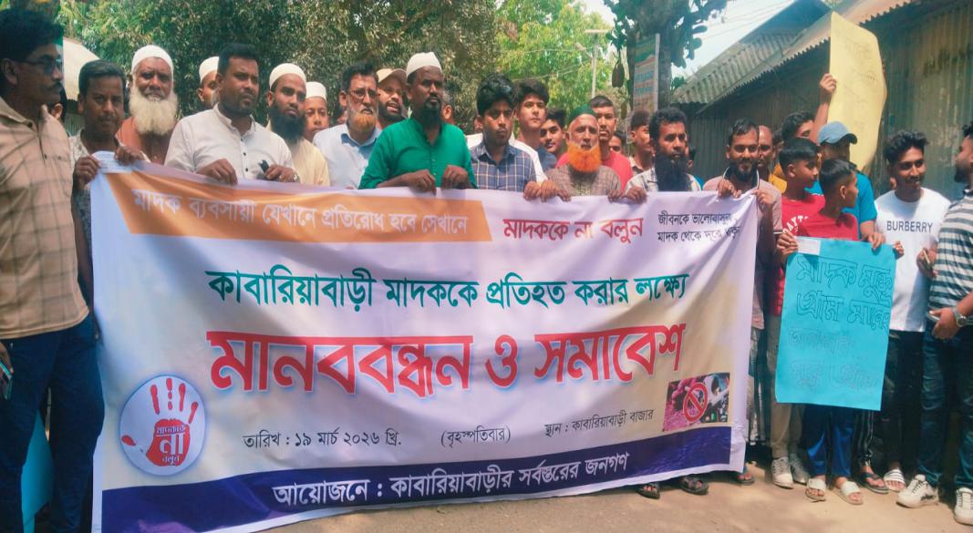 বৃহস্পতিবার (১৯ মার্চ ২০২৬) সকালে কাবারিয়াবাড়ী গ্রামে মাদক নির্মূলের দাবিতে ব্যাপক মানববন্ধন অনুষ্ঠিত হয়। গ্রামের প্রধান সড়কে আয়োজিত এ কর্মসূচিতে সর্বস্তরের জনগণ স্বতঃস্ফূর্তভাবে অংশগ্রহণ করেন। এ সময় মসজিদের ইমামসহ ধর্মপ্রাণ মুসল্লি, শিক্ষক, যুবসমাজ, জনপ্রতিনিধি এবং বিভিন্ন শ্রেণি-পেশার মানুষ উপস্থিত ছিলেন।