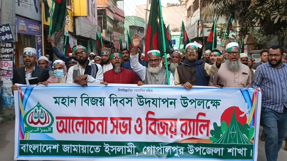 মহান বিজয় দিবস উপলক্ষে গোপালপুরে জামায়াতে ইসলামীর আলোচনা সভা ও বিজয় র্যালি অনুষ্ঠিত স্টাফ রিপোর্ট : এস কে শিপন মহান বিজয় দিবস উপলক্ষে যথাযোগ্য মর্যাদা ও ভাবগাম্ভীর্যের মধ্য দিয়ে আলোচনা সভা ও বিজয় র্যালির আয়োজন করেছে বাংলাদেশ জামায়াতে ইসলামী, গোপালপুর শাখা। মঙ্গলবার (১৬ ডিসেম্বর) সকালে গোপালপুর আলিয়া মাদ্রাসা প্রাঙ্গণ থেকে বিজয় র্যালিটি শুরু হয়। র্যালিটি গোপালপুর প্রেসক্লাবের সামনে দিয়ে প্রদক্ষিণ করে পুনরায় আলিয়া মাদ্রাসা মাঠে এসে শেষ হয়। র্যালিতে জাতীয় সংগীত, দেশাত্মবোধক স্লোগান ও ব্যানার-ফেস্টুনের মাধ্যমে মহান মুক্তিযুদ্ধের বীর শহীদদের প্রতি গভীর শ্রদ্ধা নিবেদন করা হয়। র্যালি শুরুর পূর্বে অনুষ্ঠিত আলোচনা সভায় প্রধান বক্তব্য প্রদান করেন মাওলানা হুমায়ুন কবির, এমপি পদপ্রার্থী, টাঙ্গাইল-২ (গোপালপুর-ভূয়াপুর)। তিনি তাঁর বক্তব্যে মহান মুক্তিযুদ্ধের আত্মত্যাগ ও বিজয়ের তাৎপর্য তুলে ধরে বলেন, স্বাধীনতার চেতনাকে ধারণ করে দেশ ও জাতির কল্যাণে সকলকে ঐক্যবদ্ধভাবে কাজ করতে হবে। অনুষ্ঠানে বিশেষ অতিথি হিসেবে উপস্থিত ছিলেন ভূয়াপুর উপজেলার সম্মানিত আব্দুল্লাহ আল মামুন। এছাড়াও বাংলাদেশ জামায়াতে ইসলামী গোপালপুর শাখার বিভিন্ন পর্যায়ের নেতৃবৃন্দ ও বিপুল সংখ্যক নেতাকর্মী এ কর্মসূচিতে অংশগ্রহণ করেন। বক্তারা তাঁদের বক্তব্যে বলেন, মহান বিজয় দিবস শুধু একটি আনন্দের দিন নয়, এটি আত্মত্যাগ, সংগ্রাম ও দায়িত্ববোধের শিক্ষা দেয়। দেশের স্বাধীনতা ও সার্বভৌমত্ব রক্ষায় সকলকে নৈতিকতা ও আদর্শের পথে থেকে কাজ করার আহ্বান জানান তারা। অনুষ্ঠানটি শান্তিপূর্ণ ও সুশৃঙ্খলভাবে সম্পন্ন হয়।