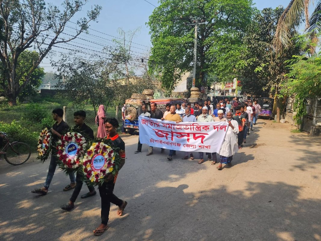 মহান স্বাধীনতা ও জাতীয় দিবসে জেলা জাসদের শ্রদ্ধা নিবেদন বাংলাদেশ জাতীয় সমাজতান্ত্রিক দল জাসদ চাঁপাইনবাবগঞ্জ জেলা শাখা বিভিন্ন কর্মসুচি পালনের মধ্যে দিয়ে দিবসটি উদযাপন করছে। বৃহস্পতিবার ২৬ মার্চ সকাল ৮ টায় শহরের নিমতলা মোড়ে সংগঠনটির জেলা কার্য্যালয় থেকে র্যালিসহকারে শহরের বিভিন্ন সড়ক ঘুরে জেলা প্রশাসন এর সামনে মহান মুক্তিযুদ্ধে শহীদ বীরদের নামাঙ্কিত স্মৃতি ফলকে ফুল দিয়ে শ্রদ্ধা নিবেদন করে।এবং শহীদদের প্রতি শ্রদ্ধা জানিয়ে ১ মিনিট নিরবতা পালন করা হয় । পরে জেলা কার্য্যালয়ের সামনে কেন্দ্রীয় জাসদের সহ সম্পাদক ও জেলা জাসদের সাধারন সম্পাদক মনিরুজ্জামান মনিরের সভাপতিত্বে সংক্ষিপ্ত আলোচনা করা হয় ।এসময় আলোচোনায় উপস্তিত ছিলেন, জেলা জাসদের সিনিয়র নেতা মো. বাবর আলি, সিনিয়র সহ সভাপতি সবুর আলি, সদর উপজেলা জাসদের সম্পাদক বাবলু, কেন্দ্রীয় জাসদ ছাত্রলীগের যুগ্ন আহব্বায়ক আব্দুল মজিদসহ সহযোগী ও অঙ্গসংগঠনের নেতাকর্মীরা।