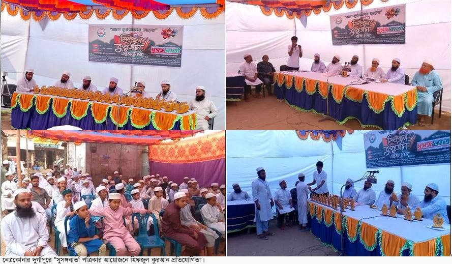 নেত্রকোনা দুর্গাপুরে ব্যাপক উৎসাহ-উদ্দীপনার মধ্য দিয়ে শিক্ষার্থীদের মাঝে ধর্মীয় শিক্ষার আলো ছড়িয়ে দিতে হিফজুল কুরআন প্রতিযোগিতা অনুষ্ঠিত হয়েছে। সোমবার (০৯ মার্চ) দিনব্যাপী পৌর শহরের প্রেসক্লাব চত্বরে এ প্রতিযোগিতার আয়োজন করে ‘সাপ্তাহিক সুসঙ্গ বার্তা পত্রিকা’। প্রতিবারের মতো এবারো পবিত্র রমজান মাস উপলক্ষে সাংবাদিক মাসউদুর রহমান ফকির এর সঞ্চালনায়, সুসঙ্গ বার্তা পত্রিকার সম্পাদক ও প্রেসক্লাবের সাবেক সাধারণ সম্পাদক জামাল তালুকদারের সভাপতিত্বে অন্যদের মধ্যে আলোচনা করেন, উপজেলা বিএনপির সাংগঠনিক সম্পাদক আলহাজ¦ জামাল উদ্দীন মাস্টার, প্রেসক্লাবের সাবেক সভাপতি এস এম রফিকুল ইসলাম রফিক, হাফেজ আব্দুল কাদির, হাফেজ ওয়ালী উল্লাহ্, হাফেজ আজিজুল ইসলাম, মাওলানা সিরাজুল ইসলাম, মুফতি তাজুল ইসলাম, মুফতি আব্দুল কাদির, হাফেজ খাইরুল ইসলাম, হাফেজ সাদেকুল ইসলাম প্রমুখ। আলোচনা শেষে, বিজয়ী শিক্ষার্থীদের হাতে পুরস্কার তুলে দেন আলহাজ¦ জামাল উদ্দীন মাস্টার। এ সময় অন্যদের মধ্যে দুর্গাপুর প্রেস ক্লাবের প্রিন্ট ও ইলেকট্রনিক্স মিডিয়ার সাংবাদিকরা, স্থানীয় সুধীজন, বিভিন্ন সামাজিক ও সাংস্কৃতিক সংগঠনের প্রধানসহ স্থানীয় গণ্যমান্য ব্যক্তিরা উপস্থিত ছিলেন। বক্তারা বলেন, সাপ্তাহিক ‘সুসঙ্গ বার্তা পত্রিকার’ সম্পাদক সাংবাদিক জামাল তালুকদার প্রতি বছরই কোমলমতি শিক্ষার্থীদের মধ্যে ধর্মীয় অনুভুতি জাগানোর জন্য হামদ নাত ও কুরআন প্রতিযোগিতার আয়োজন করে থাকেন। ওনার এ সুন্দর আয়োজনের জন্য আমরা ধন্যবাদ জানাই। এছাড়া পত্রিকার প্রতিষ্ঠাবার্ষিকী উপলক্ষেও প্রতি বছর দুর্গাপুর উপজেলায় বিভিন্ন কেটাগরিতে গুণীজনদের সম্মাননা দিয়ে থাকেন। এ মহৎ উদ্যোগ গ্রহণের জন্য আমরা সাংবাদিক জামাল তালুকদারের প্রতি কৃতজ্ঞতা এবং সাপ্তাহিক ‘সুসঙ্গ বার্তার’ সাফল্য কামনা করছি।