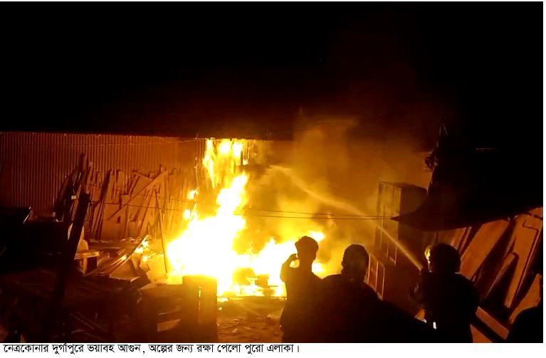 নেত্রকোনার দুর্গাপুর পৌরশহরে এমপি‘র মোড় এলাকায় একটি কাঠমিল থেকে ভয়াবহ অগ্নিকান্ডের ঘটনা ঘটেছে। মঙ্গলবার (২৫ ফেব্রুয়ারী) দিবাগত রাত আনুমানিক ৩টার দিকে আগুনের সূত্রপাত হয়। ফায়ার সার্ভিসের তাৎক্ষণিক তৎপরতায় বড় ধরনের দুর্ঘটনা থেকে রক্ষা পেয়েছে বাসাবাড়ি, বিভিন্ন কাঠের দোকান ও পুরো এলাকা। স্থানীয় সূত্রে জানা গেছে, গভীর রাতে হঠাৎ মিলের ভেতর থেকে আগুনের লেলিহান শিখা দেখতে পান প্রতিবেশীরা। মুহূর্তের মাঝে মিলের ভেতরে জমানো কাঠ ও অন্যান্য দাহ্য পদার্থে আগুন দ্রুত ছড়িয়ে পড়ে। আতঙ্কিত স্থানীয়রা তাৎক্ষণিকভাবে ফায়ার সার্ভিসে খবর দিলে, ফায়ার সার্ভিসের একটি ইউনিট দ্রুত ঘটনাস্থলে পৌঁছে আগুন নিয়ন্ত্রণে কাজ শুরু করেন। ফায়ার সার্ভিস ও সিভিল ডিফেন্সের স্টেশন অফিসার জানান, রাত ৩টার কিছু পর খবর পেয়ে আমরা ঘটনাস্থলে যাই, প্রায় এক ঘণ্টার চেষ্টায় আগুন নিয়ন্ত্রণে আনতে সক্ষম হন। আগুনের তীব্রতা বেশি থাকলেও দ্রুত ব্যবস্থা নেয়ার কারণে পার্শ্ববর্তী বসতবাড়ি, কাঠের দোকানপাট সহ পুরো এলাকায় আগুন ছড়িয়ে পড়েনি। প্রাথমিকভাবে আগুনের সুনির্দিষ্ট কারণ জানা যায়নি। তবে বৈদ্যুতিক শর্ট সার্কিট থেকে অগ্নিকান্ডের সূত্রপাত হতে পারে বলে ধারণা করা হচ্ছে। এ ঘটনায় মিলের ভেতরে থাকা মূল্যবান কাঠ ও কিছু যন্ত্রপাতি পুড়ে গেছে। ক্ষয়ক্ষতির পরিমাণ নিরূপণে সংশ্লিষ্ট কর্তৃপক্ষ কাজ করছে। ঘটনায় কোনো হতাহতের খবর পাওয়া যায়নি। তবে স্থানীয় দোকানপাট ও মিলের আশপাশের বাসাবাড়ী গুলোতে আতঙ্ক বিরাজ করছে।