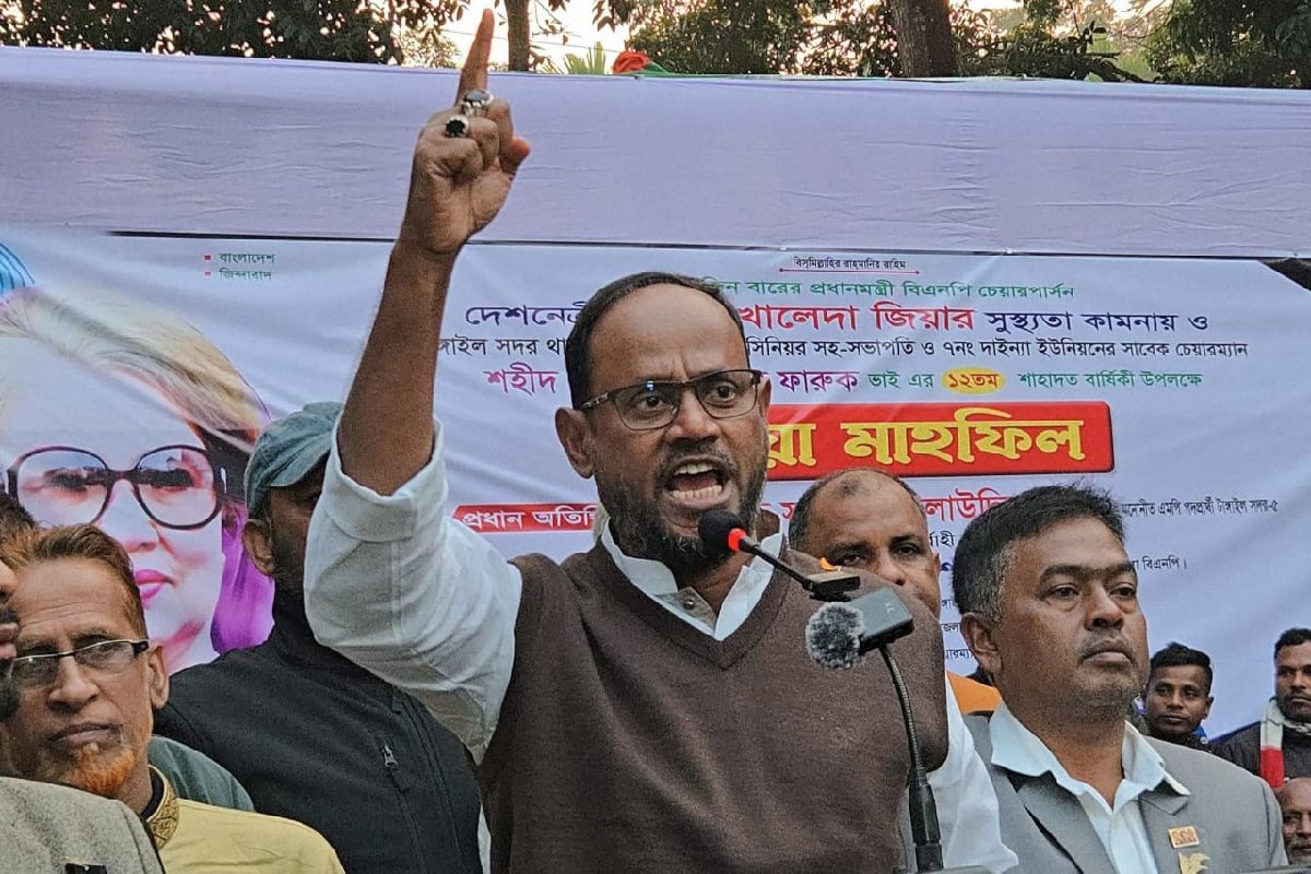 আসন্ন জাতীয় সংসদ নির্বাচনে টাঙ্গাইল-৫ (সদর) আসনে বিএনপির মনোনীত প্রার্থী ও কেন্দ্রীয় কমিটির প্রচার সম্পাদক সুলতান সালাউদ্দিন টুকুর পক্ষে দলীয় ঐক্যের সুস্পষ্ট বার্তা দিয়েছেন স্থানীয় নেতারা। দলীয় ঐক্য অটুট রেখে জনগণের ভোটাধিকার প্রতিষ্ঠায় সবাইকে ঐক্যবদ্ধভাবে মাঠে থাকার আহ্বান জানানো হয়। শনিবার (২০ ডিসেম্বর) দুপুরে টাঙ্গাইল সদর উপজেলার বিন্যাফৈর উচ্চ বিদ্যালয় মাঠে সাবেক প্রধানমন্ত্রী ও বিএনপি চেয়ারপারসন বেগম খালেদা জিয়ার সুস্থতা কামনা এবং দাইন্যা ইউনিয়নের সাবেক চেয়ারম্যান রফিকুল ইসলাম ফারুকের মৃত্যুবার্ষিকী উপলক্ষে আয়োজিত দোয়া মাহফিলে এসব কথা বলেন বিএনপি ও অঙ্গসংগঠনের নেতারা। রফিকুল ইসলাম ফারুক স্মৃতি সংঘের সভাপতি রফিকুল ইসলাম আজাদের সভাপতিত্বে অনুষ্ঠিত এ অনুষ্ঠানে প্রধান বক্তা হিসেবে উপস্থিত ছিলেন টাঙ্গাইল জেলা বিএনপির সভাপতি হাসানুজ্জামিল শাহীন। উল্লেখ্য, তিনি নিজেও টাঙ্গাইল-৫ (সদর) আসনে দলের মনোনয়ন প্রত্যাশী ছিলেন। তবে দলীয় সিদ্ধান্তের প্রতি শ্রদ্ধা জানিয়ে তিনি প্রকাশ্যে সুলতান সালাউদ্দিন টুকুর পক্ষে কাজ করার অঙ্গীকার করেন। দলীয় ঐক্যের গুরুত্ব তুলে ধরে হাসানুজ্জামিল শাহীন বলেন, ‘আপনার ধানের শীষ প্রতীকে ভোট চাওয়া কি উচিত নয়? অবশ্যই উচিত। আমি আপনাদের কাছে বিনীতভাবে অনুরোধ জানাচ্ছি, আগামী জাতীয় সংসদ নির্বাচনে টাঙ্গাইল সদরে সুলতান সালাউদ্দিন টুকুর পক্ষে ধানের শীষ প্রতীকে জনগণের কাছে ভোট প্রার্থনা করবেন। আমরা সবাই ঐক্যবদ্ধভাবে কাজ করলে টুকু সাহেব বিপুল ভোটে বিজয়ী হবেন।’ অনুষ্ঠানে বিশেষ অতিথির বক্তব্যে বিএনপির সাবেক সদস্য সচিব মাহমুদুল হক সানু বলেন, ‘টাঙ্গাইলের আটটি আসনের মধ্যে দল অত্যন্ত যাচাই-বাছাই করে আমাদের প্রিয় নেতাকে মনোনয়ন দিয়ে আপনাদের কাছে পাঠিয়েছে। এখন আপনাদের দায়িত্ব হলো—টাঙ্গাইলের অন্য সব আসনের তুলনায় সদর আসনে সর্বোচ্চ ভোটে তাকে নির্বাচিত করা।’ অন্যান্য বক্তারা বলেন, কেন্দ্রীয় নেতৃত্ব যে আস্থা ও বিশ্বাস নিয়ে টাঙ্গাইল-৫ আসনে সুলতান সালাউদ্দিন টুকুকে মনোনয়ন দিয়েছেন, তা দলের ঐক্য ও দায়িত্ববোধের প্রতিফলন। দল ও জনগণের বৃহত্তর স্বার্থে অতীতের সব বিভেদ ভুলে গিয়ে সবাইকে ঐক্যবদ্ধভাবে ধানের শীষের বিজয় নিশ্চিত করতে হবে। এজন্য তৃণমূল পর্যায়ে সাংগঠনিক শক্তি বাড়ানো এবং নেতাকর্মীদের আরও সক্রিয় ভূমিকা রাখার আহ্বান জানান তারা। অনুষ্ঠানে বিশেষ অতিথি হিসেবে উপস্থিত ছিলেন সদর উপজেলা বিএনপির সভাপতি আজগর আলী। এছাড়াও জেলা যুবদলের আহ্বায়ক খন্দকার রাশেদুল আলম রাশেদ, জেলা শ্রমিক দলের সাধারণ সম্পাদক ও কেন্দ্রীয় কমিটির সদস্য এ. কে. এম. মনিরুল হক (ডিপি মনির)সহ বিএনপি, যুবদ