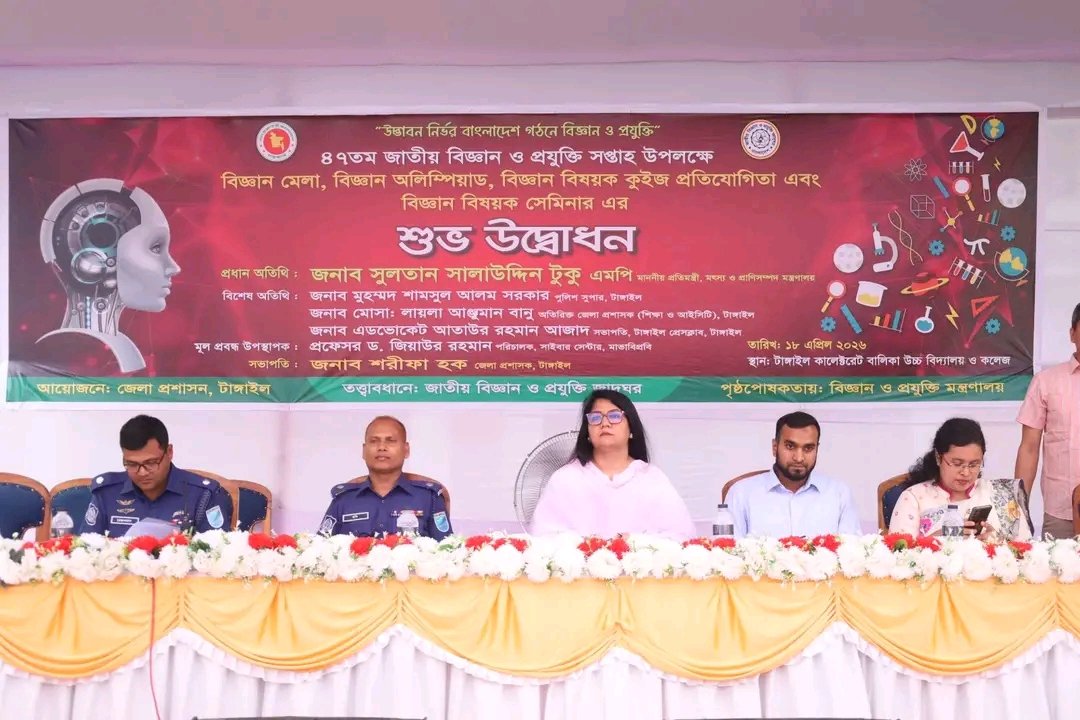 টাঙ্গাইলে ৪৭তম বিজ্ঞান ও প্রযুক্তি সপ্তাহ ২০২৬ উপলক্ষে বিজ্ঞান মেলা উদ্বোধন জেলা পর্যায়ে ৪৭তম বিজ্ঞান ও প্রযুক্তি সপ্তাহ ২০২৬ উপলক্ষে আজ ১৮ এপ্রিল, ২০২৬ তারিখ জেলা প্রশাসক টাঙ্গাইলের উদ্বোধনী অনুষ্ঠানে অংশগ্রহণ করেন। জেলা প্রশাসন আয়োজিত বিজ্ঞান মেলা টাঙ্গাইল কালেক্টরেট বালিকা উচ্চ বিদ্যালয় ও কলেজ মাঠে অনুষ্ঠিত হয়।বিজ্ঞান মেলায় জেলার বিভিন্ন স্কুল ওকলেজের শিক্ষার্থীরা অংশগ্রহণ করে তাদের উদ্ভাবনী প্রকল্প বৈজ্ঞানিক ধারণা এবং প্রযুক্তি ভিত্তিক প্রদর্শনী উপস্থাপন করেন। মেলাটি আগামী ২০ এপ্রিল পর্যন্ত চলবে।জেলা প্রশাসক উদ্বোধনী বক্তব্যে বলেন বিজ্ঞান ও প্রযুক্তি শিক্ষার প্রসারে এই ধরনের উদ্যোগ শিক্ষার্থীদের সৃজনশীলতা এবং উদ্ভাবনী মনোভাব বিকাশে গুরুত্বপূর্ণ ভূমিকা রাখে। দেশের তরুণ প্রজন্মের জন্য এ ধরনের মেলা শিক্ষার দিগন্তকে প্রসারিত করে।” প্রদর্শনীতে শিক্ষার্থীরা বিভিন্ন বৈজ্ঞানিক মডেল, রোবোটিক্স, প্রযুক্তি উদ্ভাবন এবং পরিবেশ বান্ধব প্রকল্পের মাধ্যমে তাদের দক্ষতা প্রদর্শন করেন।অনুষ্ঠানটিজেলারশিক্ষাপ্রতিষ্ঠানগুলোর শিক্ষার্থীদের জন্য উৎসাহব্যঞ্জক একটি প্ল্যাটফর্ম হিসেবে বিবেচিত হচ্ছে।