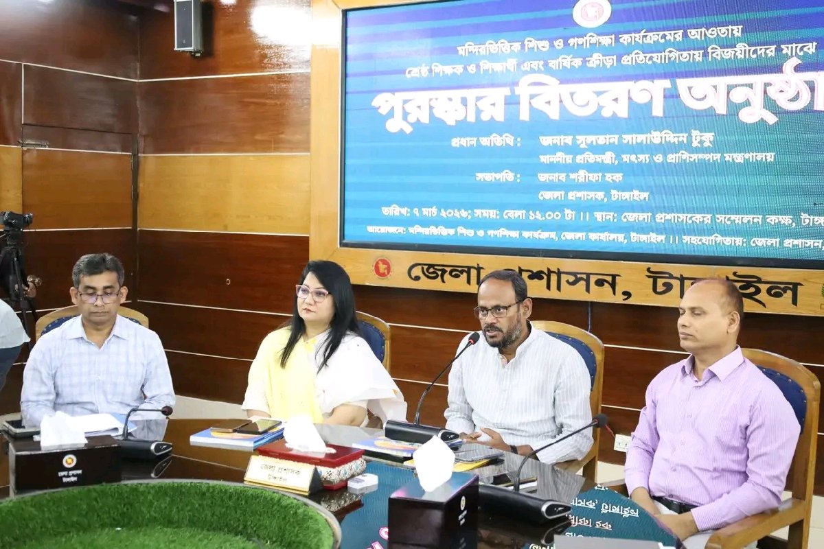 টাঙ্গাইলে মন্দিরভিত্তিক শিক্ষা কার্যক্রমে শ্রেষ্ঠ শিক্ষক-শিক্ষার্থীদের পুরস্কার প্রদান টাঙ্গাইলে মন্দিরভিত্তিক শিশু ও গণশিক্ষা কার্যক্রমের আওতায় শ্রেষ্ঠ শিক্ষক-শিক্ষার্থী এবং বার্ষিক ক্রীড়া প্রতিযোগিতার বিজয়ীদের মাঝে পুরস্কার বিতরণ করা হয়েছে। শনিবার জেলা প্রশাসকের সম্মেলন কক্ষে আয়োজিত অনুষ্ঠানে প্রধান অতিথি হিসেবে উপস্থিত ছিলেন সুলতান সালাউদ্দিন টুকু এমপি। প্রধান অতিথির বক্তব্যে তিনি বলেন মন্দিরভিত্তিক শিক্ষা কার্যক্রম শুধু ধর্মীয় শিক্ষার ক্ষেত্রেই সীমাবদ্ধ নয় এটি অসাম্প্রদায়িক চেতনা ও মানবিক মূল্যবোধ গঠনের একটি গুরুত্বপূর্ণ মাধ্যম। তিনি বলেন “মন্দিরভিত্তিক শিক্ষা কার্যক্রম শুধু ধর্মীয় শিক্ষার জায়গা নয় এটি অসাম্প্রদায়িক চেতনা ও মানবিক মূল্যবোধ বিকাশের একটি মডেল হয়ে উঠুক—এটাই আমাদের কামনা। তিনি আরও বলেন দেশের প্রান্তিক পর্যায়ের শিশুদের শিক্ষার আলোয় সম্পৃক্ত করতে এই কার্যক্রম গুরুত্বপূর্ণ ভূমিকা রাখছে। বিজয়ী শিক্ষার্থীদের উদ্দেশে তিনি ভবিষ্যতে পড়াশোনায় আরও মনোযোগী হওয়ার আহ্বান জানান।অনুষ্ঠানে সভাপতিত্ব করেন শরীফা হক জেলা প্রশাসক টাঙ্গাইল। তিনি তাঁর বক্তব্যে বলেন মন্দিরভিত্তিক শিক্ষাকেন্দ্রগুলোর মানোন্নয়নে জেলা প্রশাসনের পক্ষ থেকে সর্বাত্মক সহযোগিতা অব্যাহত থাকবে। পরে প্রধান অতিথি ও অন্যান্য বিশেষ অতিথিরা বিভিন্ন ক্যাটাগরিতে বিজয়ী শিক্ষক ও শিক্ষার্থীদের হাতে সনদপত্র ও ক্রেস্ট তুলে দেন। অনুষ্ঠানে জেলার বিভিন্ন উপজেলা থেকে আগত শতাধিক শিক্ষক-শিক্ষার্থী ও অভিভাবক উপস্থিত ছিলেন।