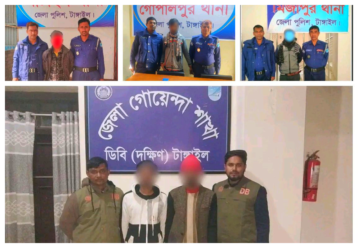 টাঙ্গাইলে অপরাধ দমনে পুলিশের সাঁড়াশি অভিযান মাদক উদ্ধারসহ ২৪ ঘণ্টায় গ্রেপ্তার ২৭ ১৬ জানুয়ারি ২০২৬ টাঙ্গাইল জেলায় মাদক ও অপরাধের বিরুদ্ধে কঠোর অবস্থান নিয়েছে জেলা পুলিশ। আইনশৃঙ্খলা পরিস্থিতি নিয়ন্ত্রণে রাখতে টাঙ্গাইল জেলা পুলিশের নিয়মিত ও সমন্বিত অভিযানে গত ২৪ ঘণ্টায় মাদক উদ্ধারসহ বিভিন্ন মামলায় মোট ২৭ জনকে গ্রেপ্তার করা হয়েছে।জেলা পুলিশ সূত্রে জানা যায় মাদক ব্যবসা পরোয়ানাভুক্ত আসামি ও বিভিন্ন অপরাধমূলক কর্মকাণ্ডের সঙ্গে জড়িতদের আইনের আওতায় আনতে সম্মানিত পুলিশ সুপার টাঙ্গাইল মহোদয়ের সরাসরি নির্দেশনায় জেলার সকল থানা ও ইউনিটের ইনচার্জদের নেতৃত্বে একযোগে মাঠপর্যায়ে অভিযান পরিচালনা করা হয়। দিন-রাত নিরবচ্ছিন্ন এ অভিযানে জেলার গুরুত্বপূর্ণ স্থানগুলোতে চেকপোস্ট টহল ও বিশেষ নজরদারি জোরদার করা হয়।অভিযানের অংশ হিসেবে প্রিভেন্টিভ ব্যবস্থা নিয়মিত মামলা এবং পরোয়ানাভুক্ত আসামিদের বিরুদ্ধে অভিযান চালিয়ে মোট ২৭ জনকে গ্রেপ্তার করা হয়। এর মধ্যে মাদকবিরোধী অভিযানে উল্লেখযোগ্য সাফল্য অর্জন করে জেলা পুলিশ। এ সময় ১২৯ পিস ইয়াবা ট্যাবলেট ও ০৫ গ্রাম হেরোইন উদ্ধার করা হয়। উদ্ধারকৃত মাদকসহ ৪ জন পেশাদার মাদক ব্যবসায়ীকে হাতেনাতে গ্রেপ্তার করা হয়েছে। পুলিশ জানায় মাদক কারবারিদের বিরুদ্ধে ‘জিরো টলারেন্স’ নীতিতে কাজ করছে জেলা পুলিশ। মাদক সমাজ ধ্বংসের অন্যতম প্রধান কারণ হওয়ায় এর সঙ্গে জড়িত কাউকে ছাড় দেওয়া হবে না। গ্রেপ্তারকৃতদের বিরুদ্ধে সংশ্লিষ্ট থানায় আইনানুগ ব্যবস্থা গ্রহণ প্রক্রিয়াধীন রয়েছে।এদিকে জেলা পুলিশের এ ধরনের তৎপরতায় সাধারণ মানুষের মাঝে স্বস্তি ফিরেছে বলে জানান স্থানীয়রা। তারা জানান নিয়মিত অভিযান ও টহল বাড়লে অপরাধপ্রবণতা কমে আসবে এবং জননিরাপত্তা আরও জোরদার হবে।টাঙ্গাইল জেলা পুলিশ জানিয়েছে, অপরাধ দমন ও মাদক নির্মূলে ভবিষ্যতেও এ ধরনের অভিযান অব্যাহত থাকবে। অপরাধ দমনে সাধারণ জনগণের সহযোগিতা কামনা করে জেলা পুলিশের পক্ষ থেকে বলা হয় ।
