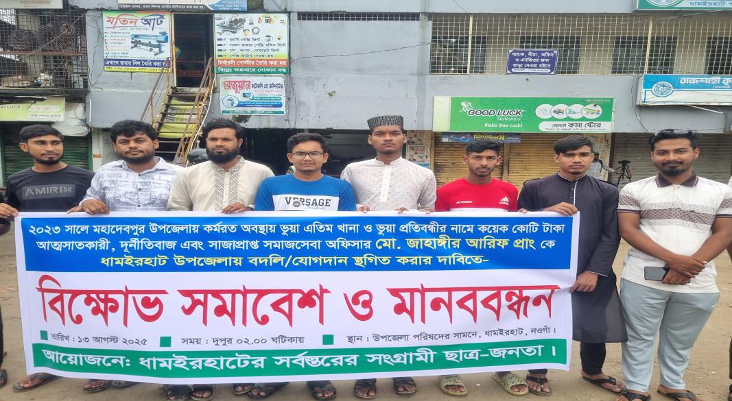 নওগাঁর ধামইরহাটে সদ্য বদলী হয়ে আসা এক সমাজসেবা কর্মকর্তাকে দুর্নীতিবাজ আখ্যায়িত করে তার যোগদান ঠেকাতে মানববন্ধন ও বিক্ষোভ সমাবেশ করেছে স্থানীয় ছাত্র জনতা।