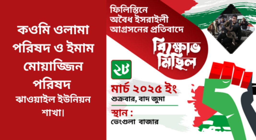 ঝাওয়াইল প্রতিনিধি: ফিলিস্তিনে অবৈধ ইসরাইলি আগ্রাসনের প্রতিবাদে ঝাওয়াইল ইউনিয়নে বিক্ষোভ মিছিলের আহ্বান জানানো হয়েছে। আগামী ২৮ মার্চ, শুক্রবার, জুমার নামাজের পর নিজ নিজ মসজিদ থেকে মিছিল বের করে ভেংগুলা বাজারে উপস্থিত থাকার জন্য আহ্বান জানিয়েছে কওমি ওলামা পরিষদ ও ইমাম মোয়াজ্জিন পরিষদ, ঝাওয়াইল ইউনিয়ন শাখা।